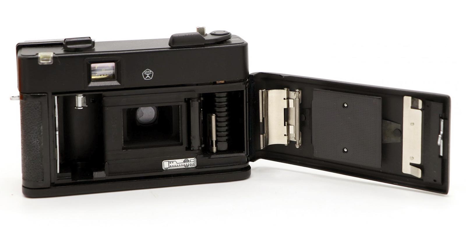 с откидной задней стенкой. Счётчик кадров самосбрасывающийся.
