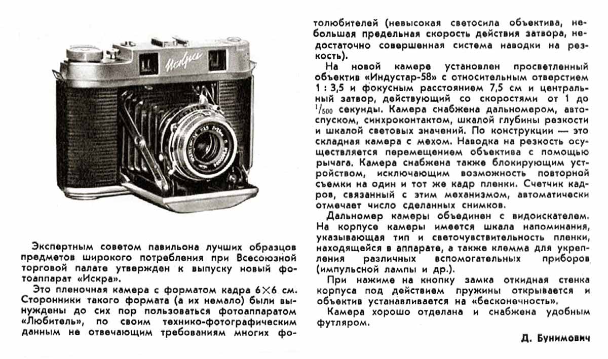 размером 6 х 6 см. Объектив "Индустар-58" - 3,5/75 мм, сопряжён с дальномером.