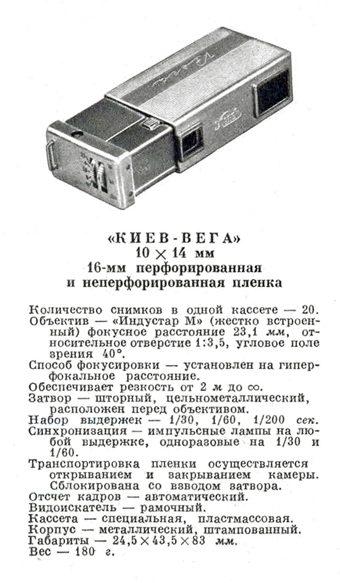 "Киев-Вега" выпускался с 1959 года Киевским заводом "Арсенал". Миниатюрный
