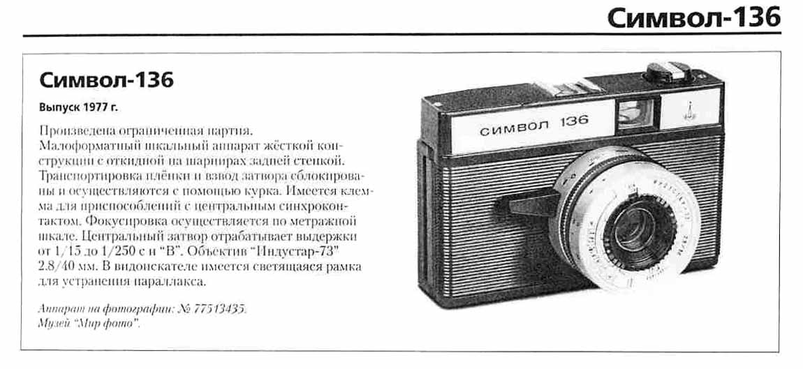 Малоформатный шкальный фотоаппарат "Символ-136" в 1977 году ограниченной серией выпущен на Ленинградском ОМО.