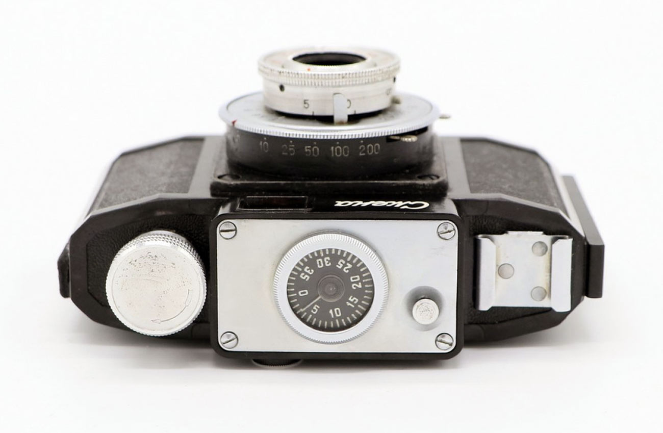 Вверху на корпусе аппарата находится счётчик кадров со спусковой кнопкой,