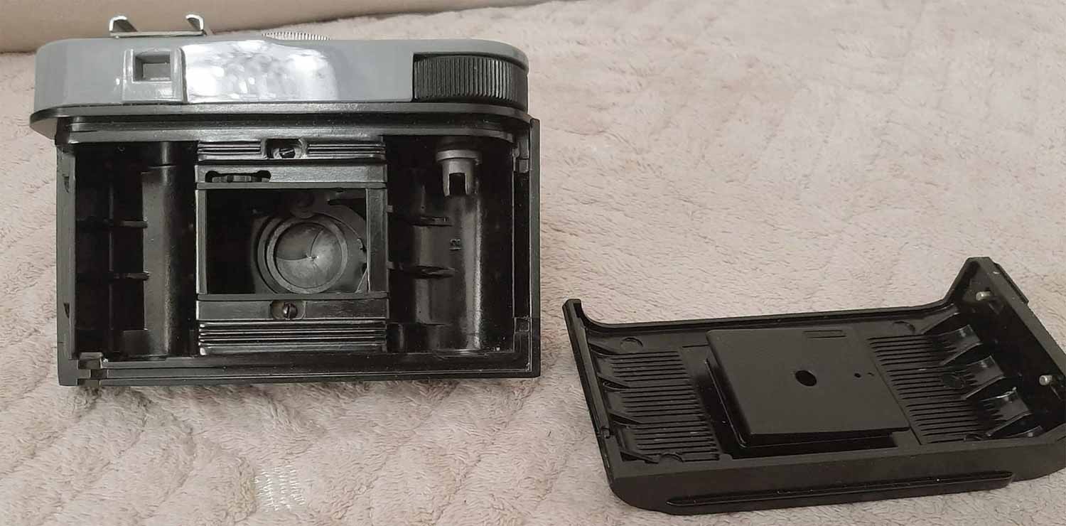 кассеты в приёмную, обратной перемотки плёнки нет. Корпус камеры пластмассовый,