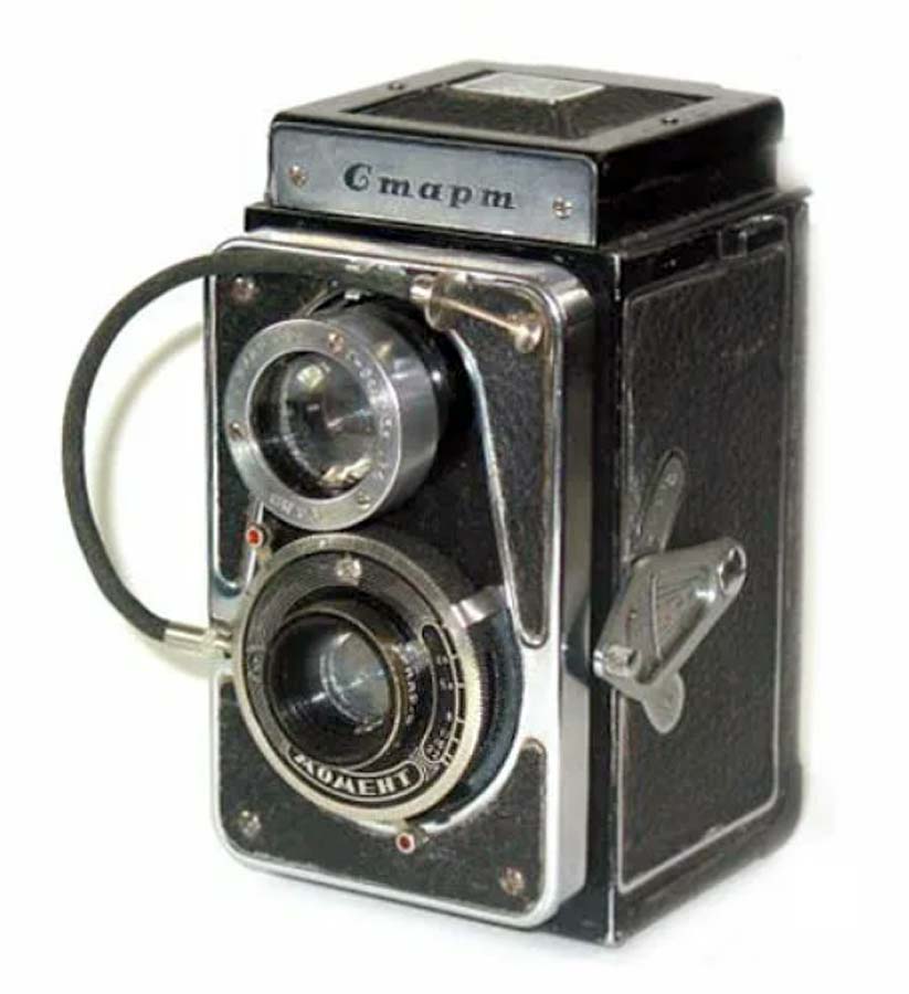 Двухобъективный среднеформатный зеркальный фотоаппарат "Старт" разработан предположительно в 1959 году. Вмещает 21 кадр размером 6 х 6 см на фотоплёнке типа "120".