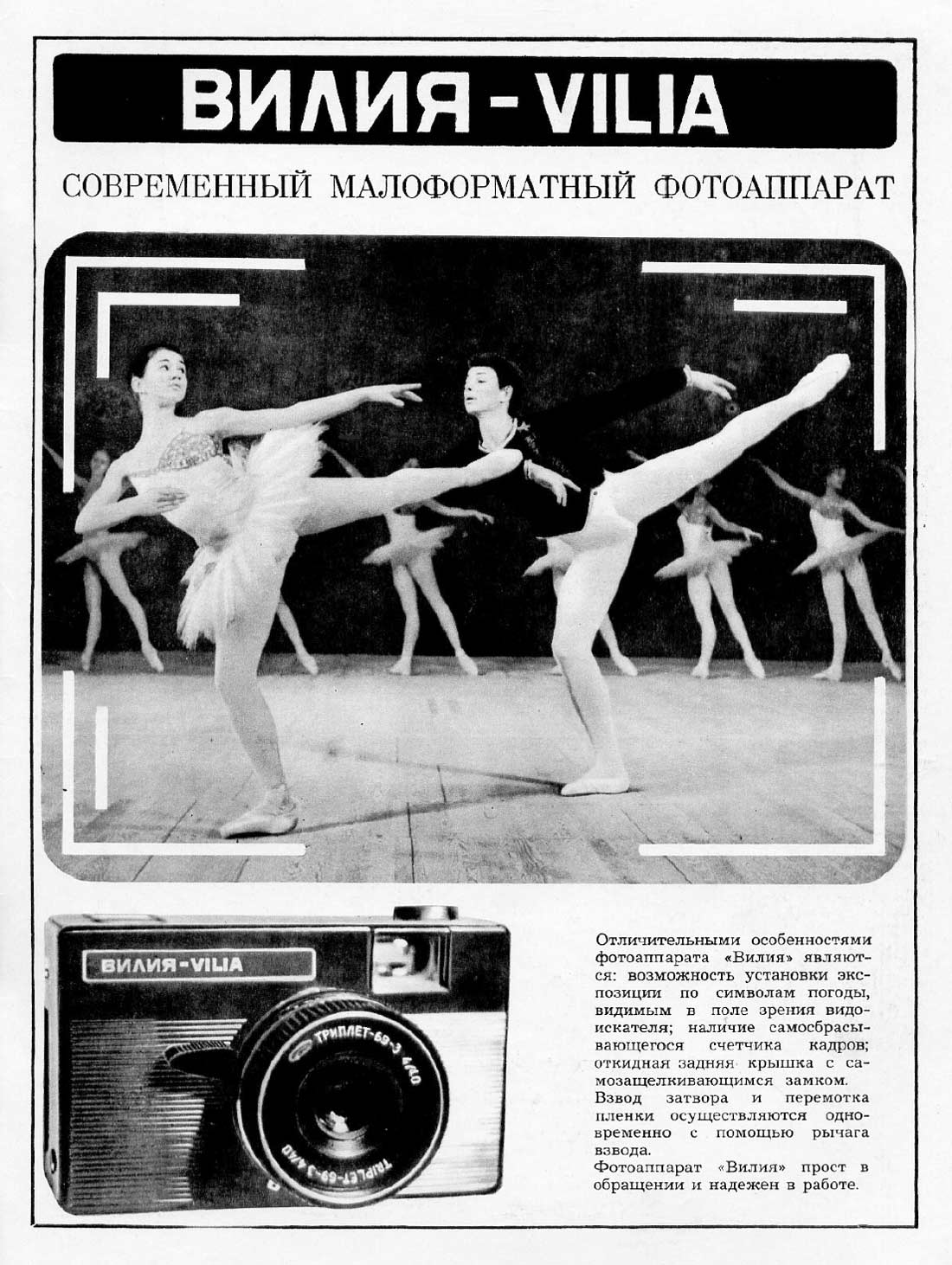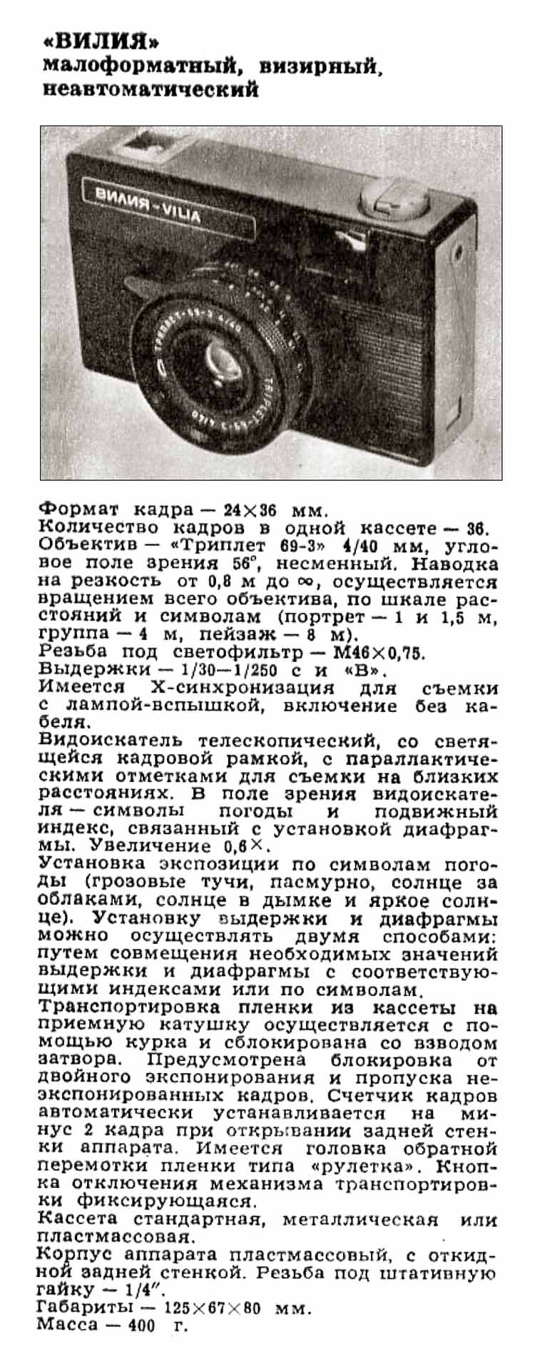 Фотоаппарат "Вилия" (Vilia) выпускался с 1974 года Белорусским ОМО. Подробная информация о модели в проспектах.