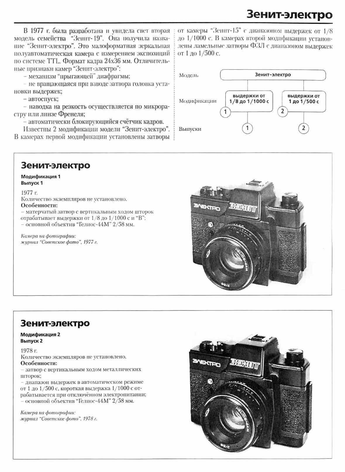 Малоформатный зеркальный полуавтоматический фотоаппарат "Зенит-электро" опытно выпускался с 1977 по 1978 годы на Красногорском механическом заводе.