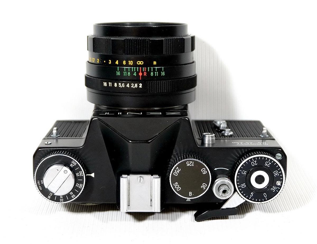 с фотоплёнкой 35 мм. Имеет полуавтоматический экспонометр, синхронизатор