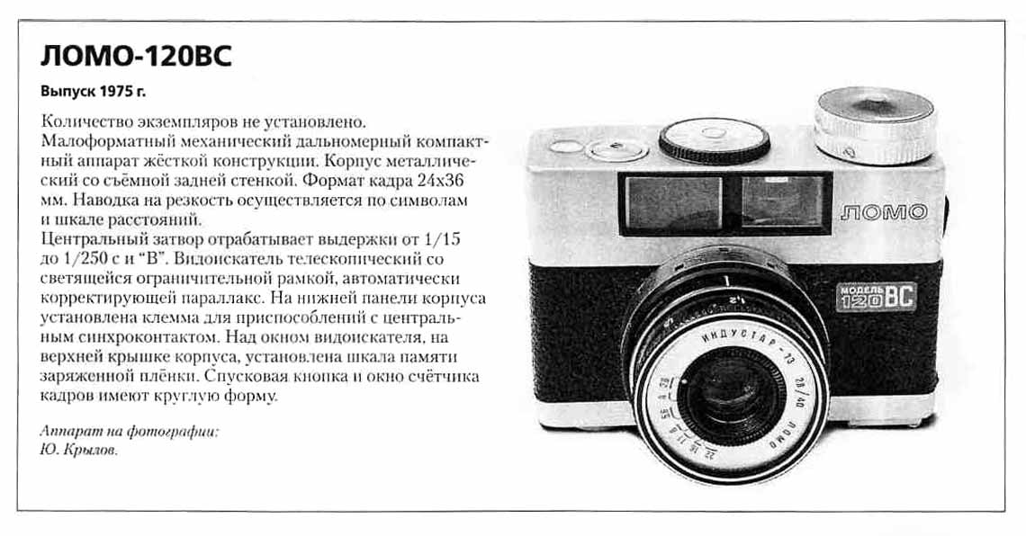 Малоформатный механический дальномерный фотоаппарат "Ломо-120ВС" с 1975 года опытно выпускался на Ленинградском оптико-механическом объединении. Пружинный завод.