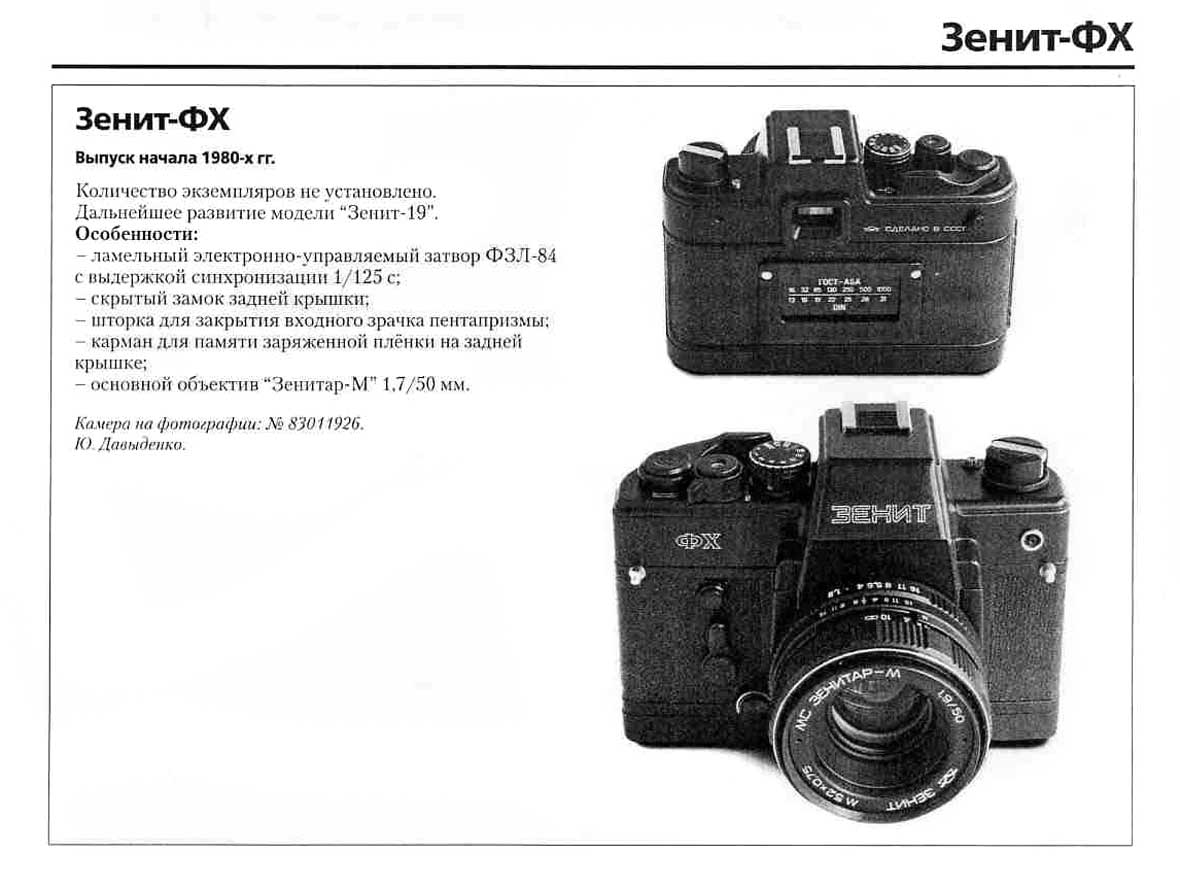 Малоформатный зеркальный фотоаппарат "Зенит ФХ" опытно выпущен возможно в 1982 году на КМЗ. Стал дальнейшим развитием модели "Зенит-19".