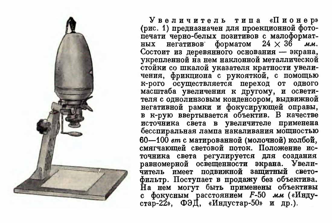 Фотоувеличитель "Пионер" производился предположительно с 1957 года. Изготовитель не установлен.