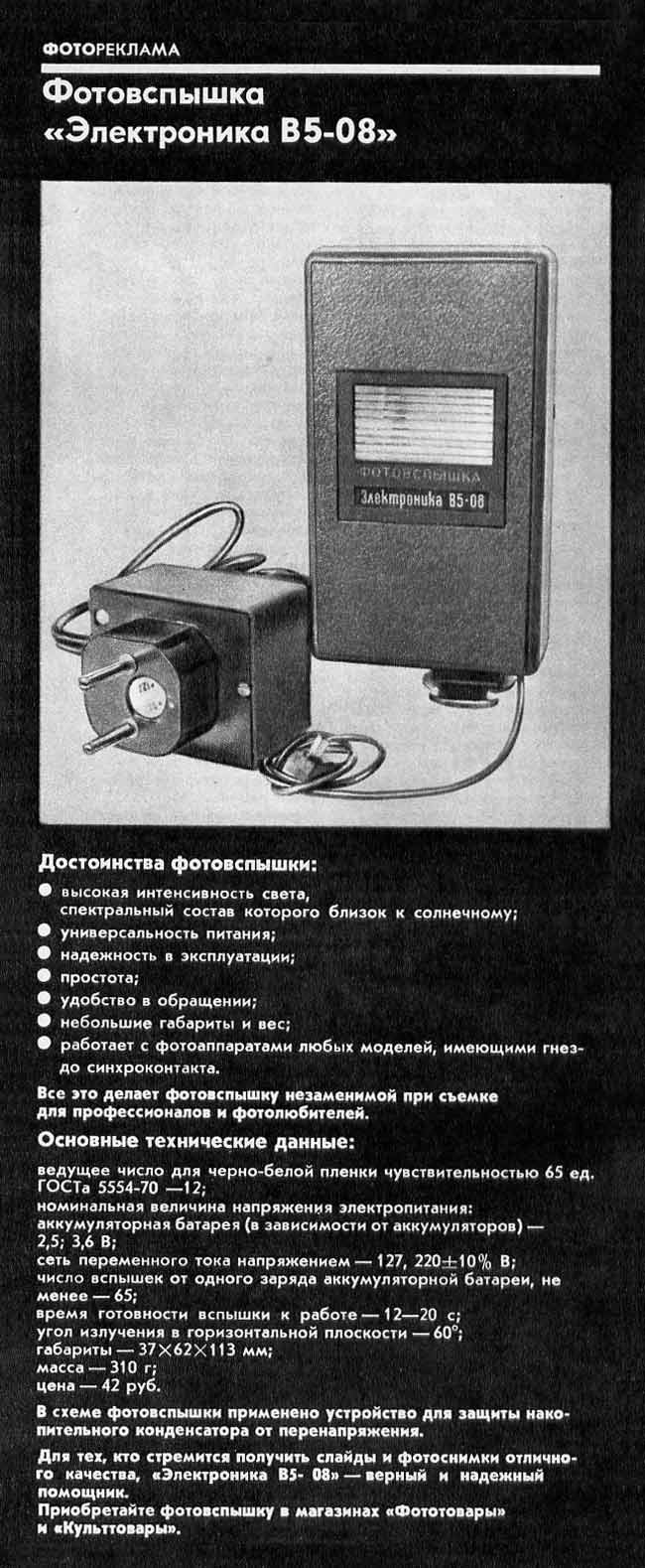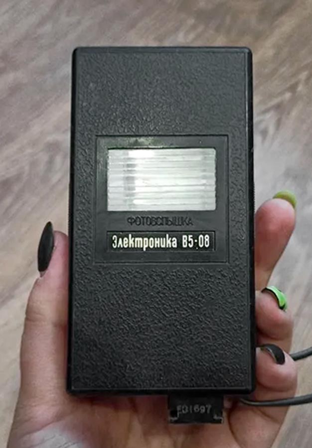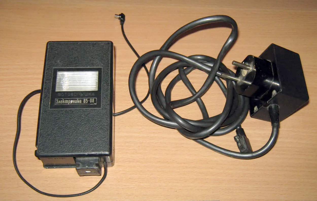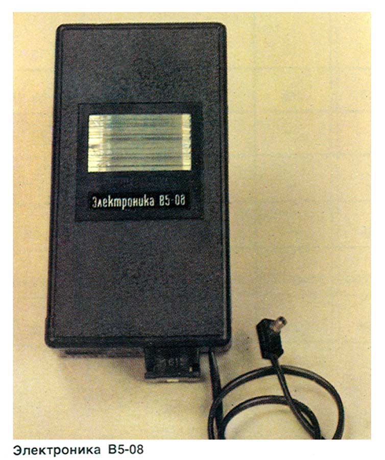 Малогабаритная электронная фотовспышка "Электроника В5-08" производилась предположительно с 1977 года. Служит для освещения фотографируемого объекта при недостаточности и отсутствии освещения.