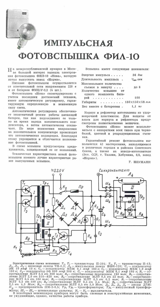 Электронная импульсная фотовспышка "ФИЛ-10" (FIL-10) производилась предположительно с 1963 года Таллинским заводом "Норма". Фотографий пока нет.