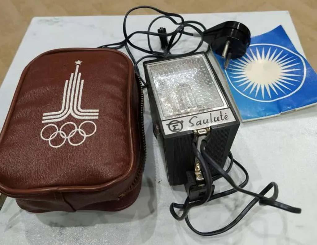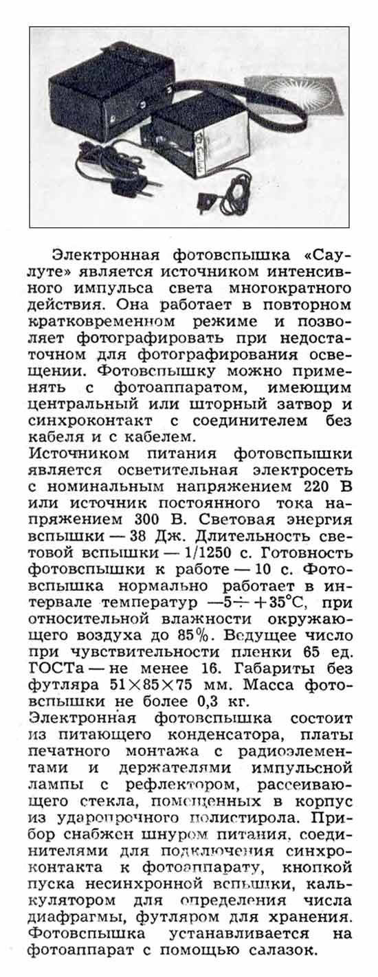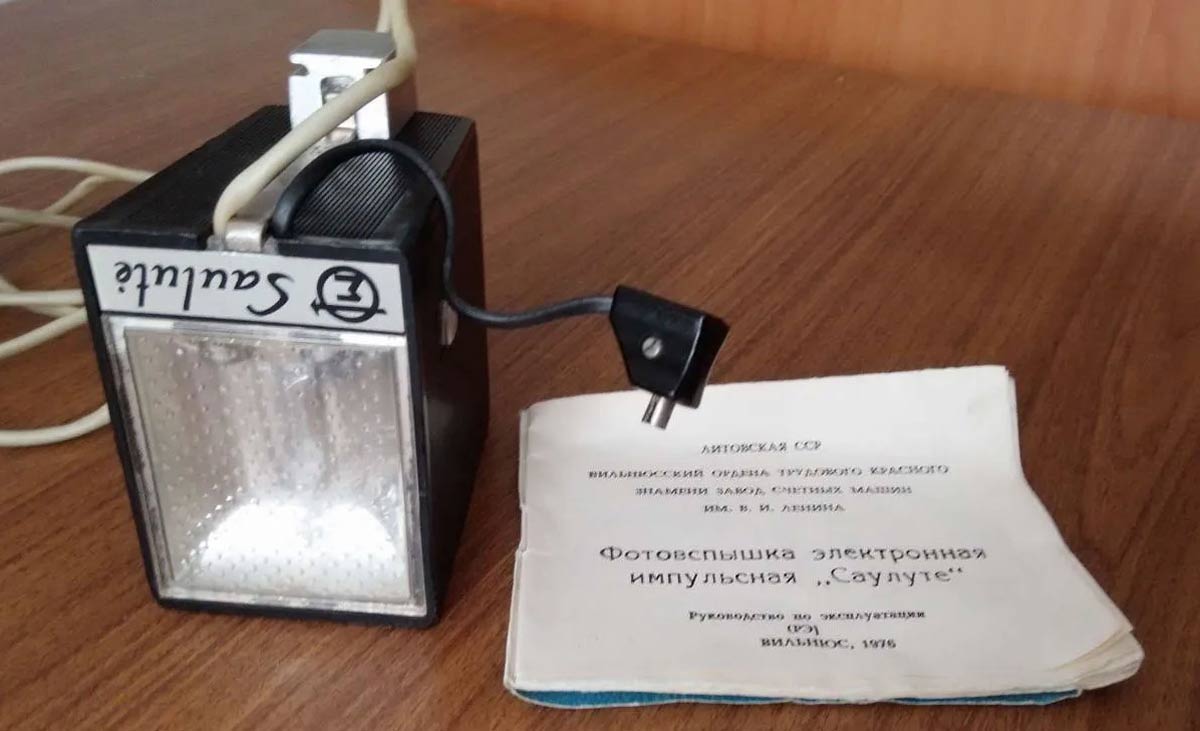 Электронная фотовспышка "Саулуте" выпускалась возможно с 1975 года Пабрадским заводом счётного машиностроения "Модулис", Литовская ССР.