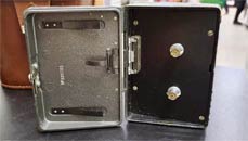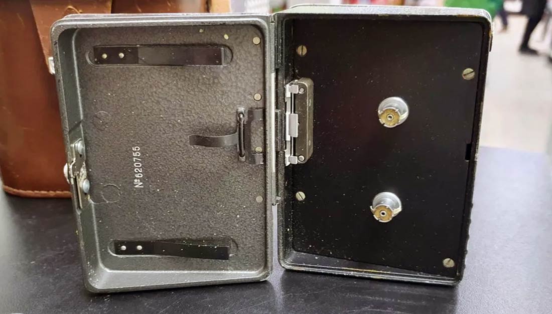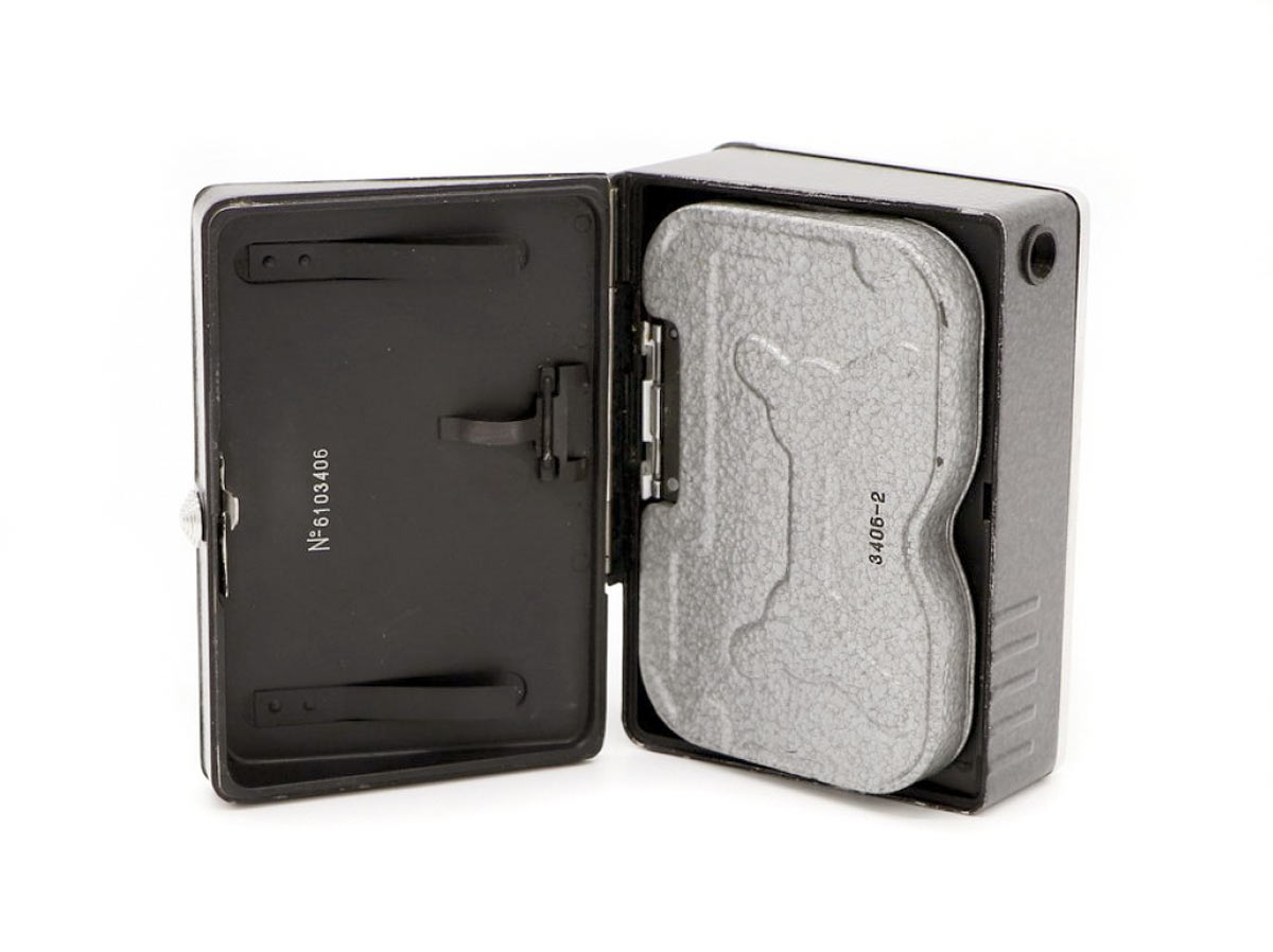 кассета, вмещающая 10 м. киноплёнки 1х8 мм. Объектив триплет-анастигмат