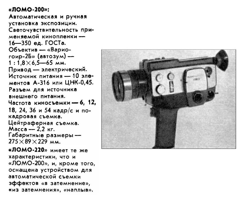 о кинокамерах "ЛОМО-200" и "Ломо-220" на сайте https://kinofototeh.ucoz.ru/. |