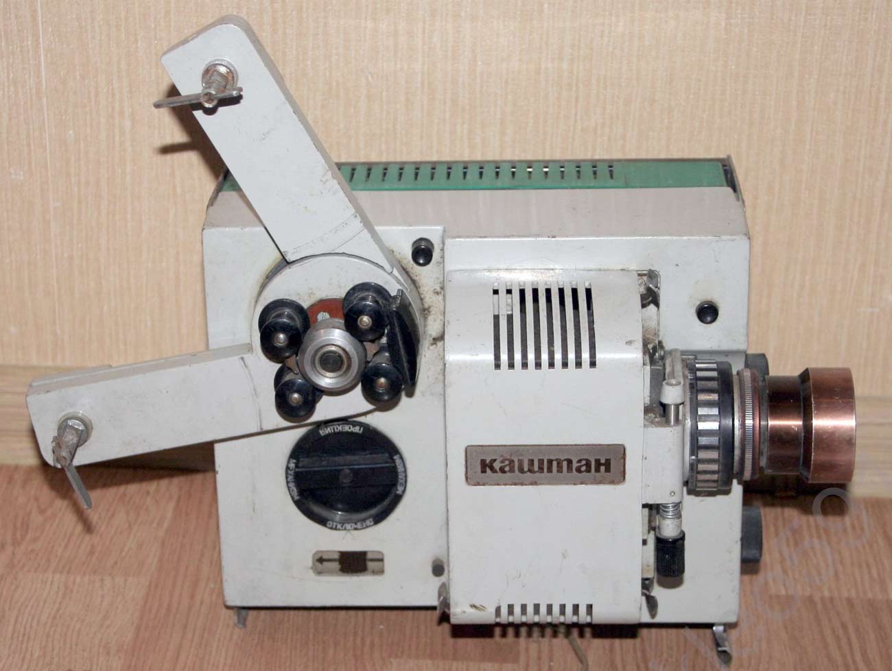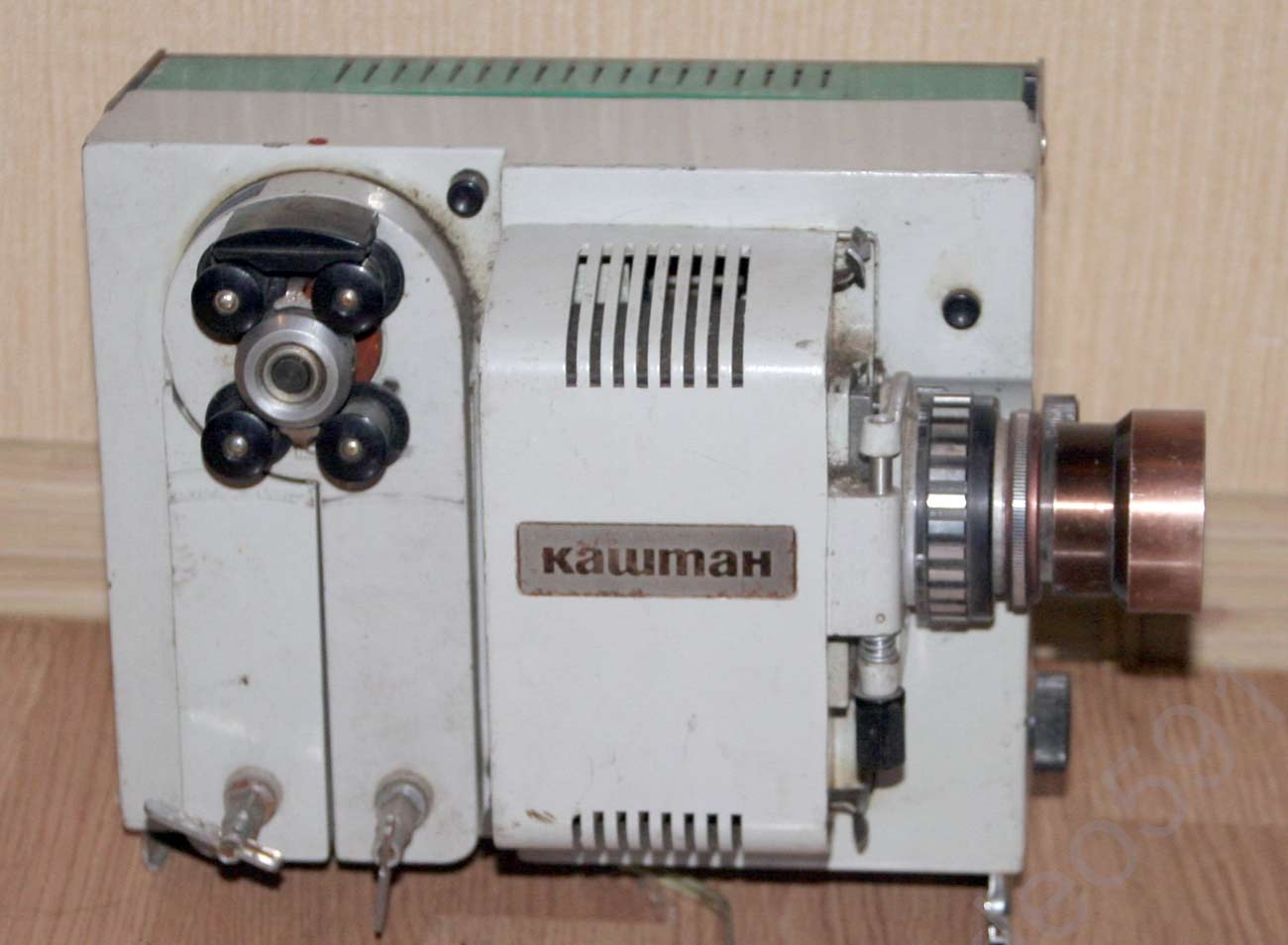 на бобины, вмещающих до 120 м. плёнки. Имеет прямую и обратную проекцию
