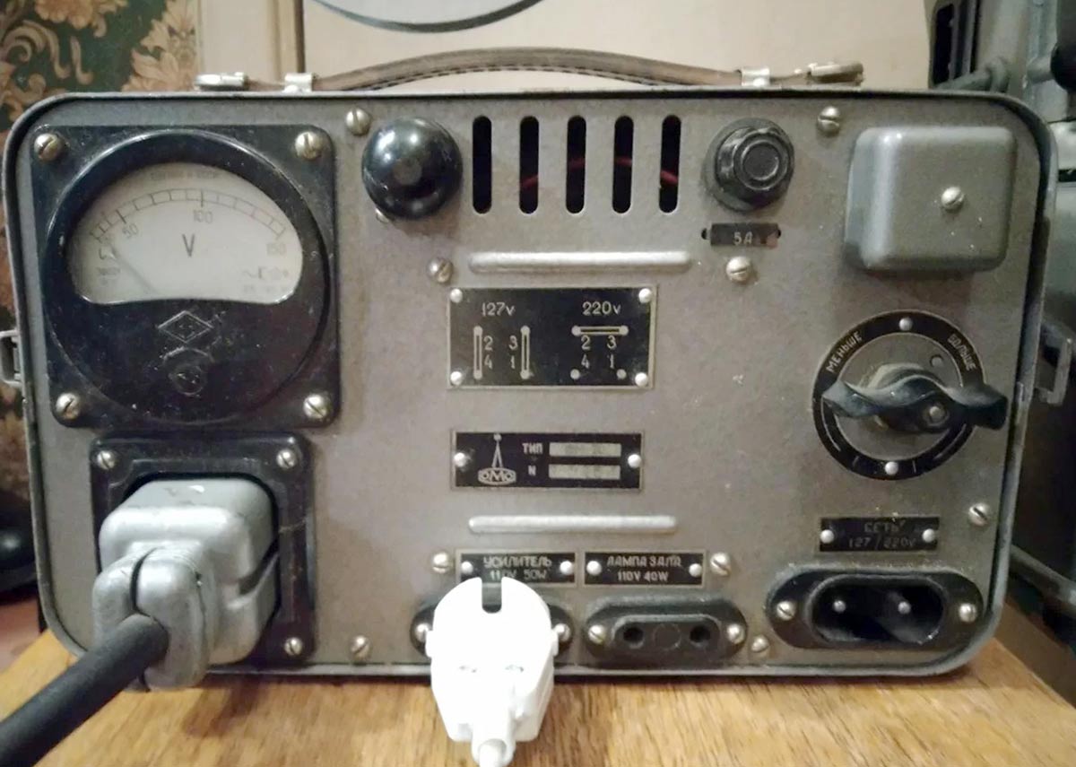 с бобинами на 120 и 600 метров киноплёнки. Питание от сети 220 В. Потребляемая