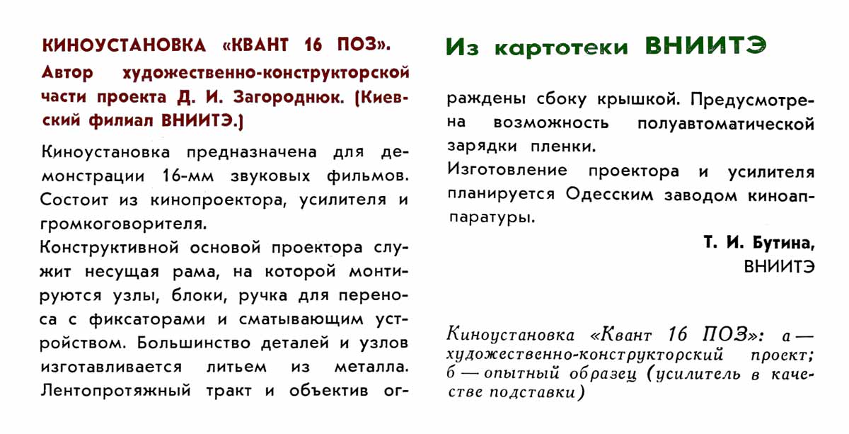Звуковая киноустановка "Квант 16 ПОЗ" разработана во ВНИИТЭ предположительно в 1975 году. Информация и фотографии киноустановки "Квант 16 ПОЗ" есть в журнале "Техническая эстетика" № 2 за 1976 год.