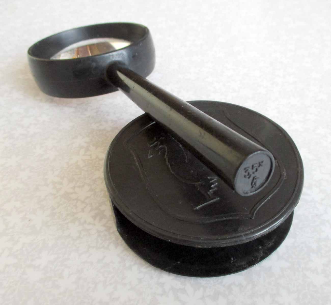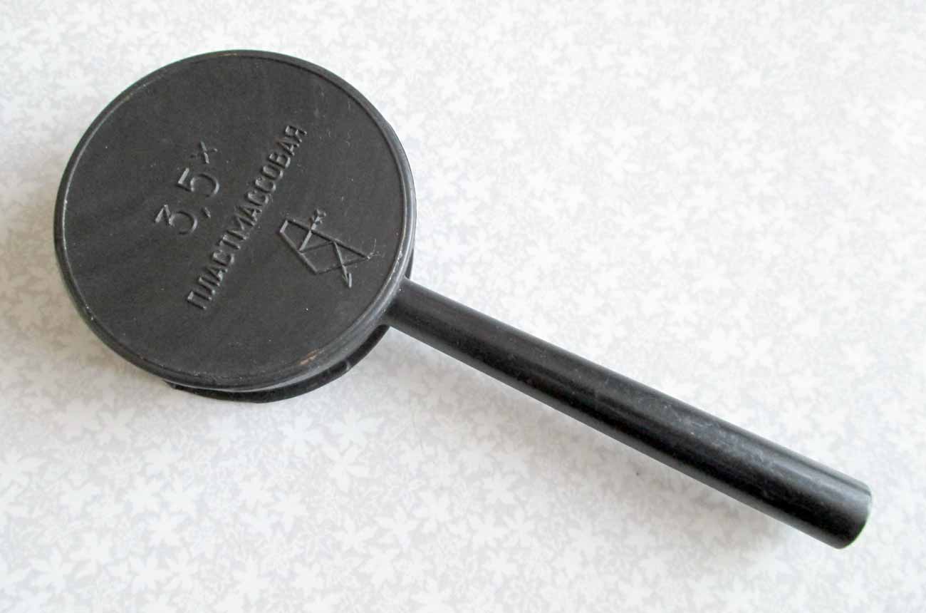 Лупа 3,5 кратная пластмассовая с футляром выпускалась возможно с 1985 года Казанским оптико-механическим заводом № 237. Рабочий диаметр линзы 52 мм. Длина ручки 95 мм.