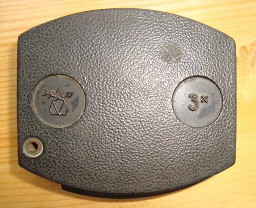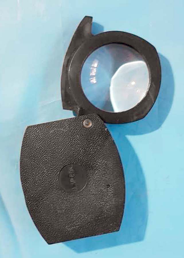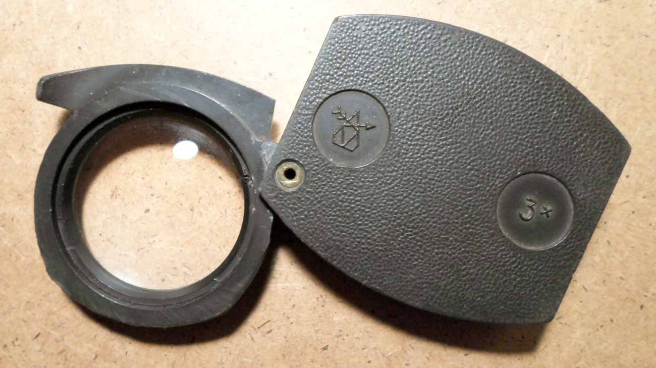Лупа складная пластмассовая с трёхкратным увеличением (3х) выпускалась предположительно с 1975 года Ленинградским Оптико-Механическим Объединением (ЛОМО).