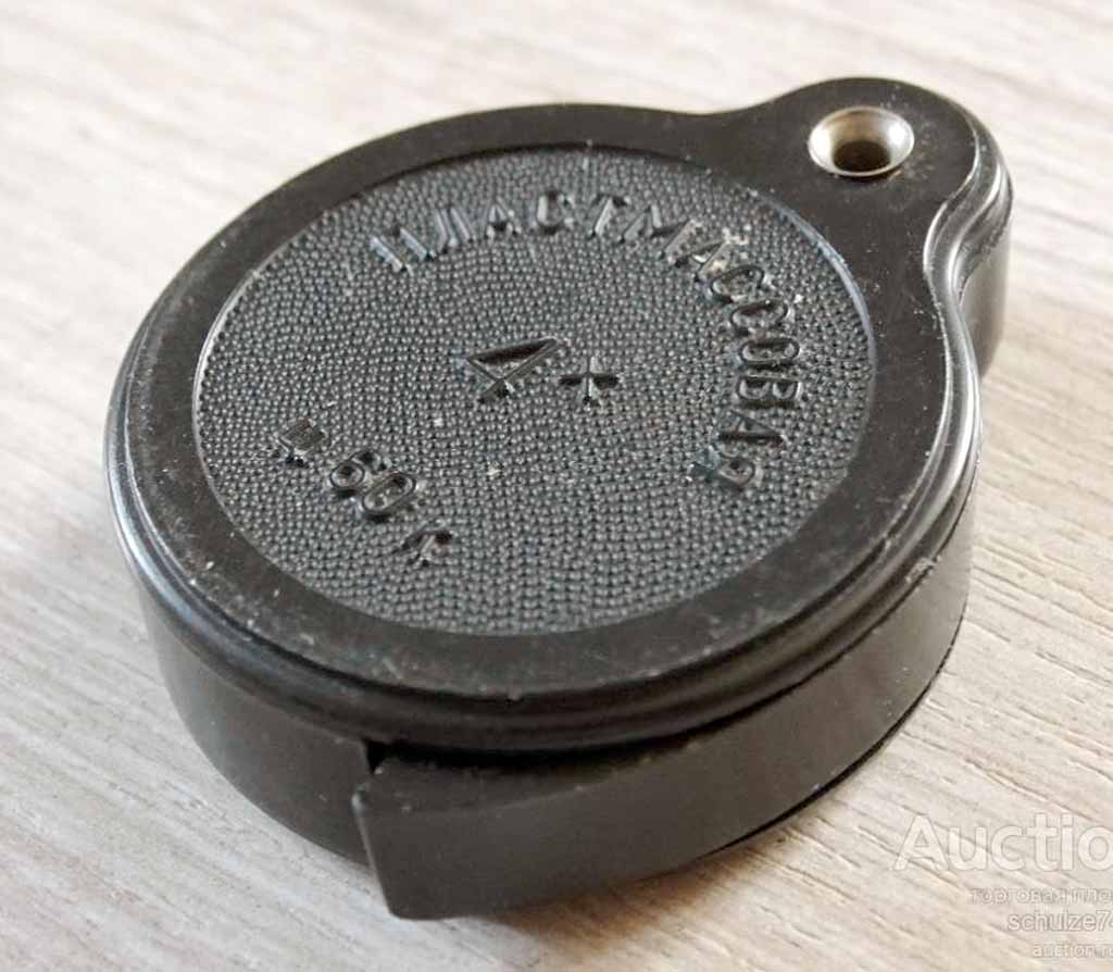 Лупа 4х (четырёхкратная) складная, пластмассовая выпускалась возможно с 1969 года Казанским оптико-механическим заводом №237. Рабочий диаметр линзы 18 мм. Габариты 30 х 40 х 10 мм. Цена различная.
