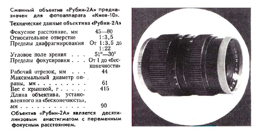 Фотографический объектив "Рубин-2А" (45-80 мм f/3.5 Автомат) производился предположительно с 1969 года Киевским заводом "Арсенал". Сменный объектив для фотоаппарата "Киев-10".