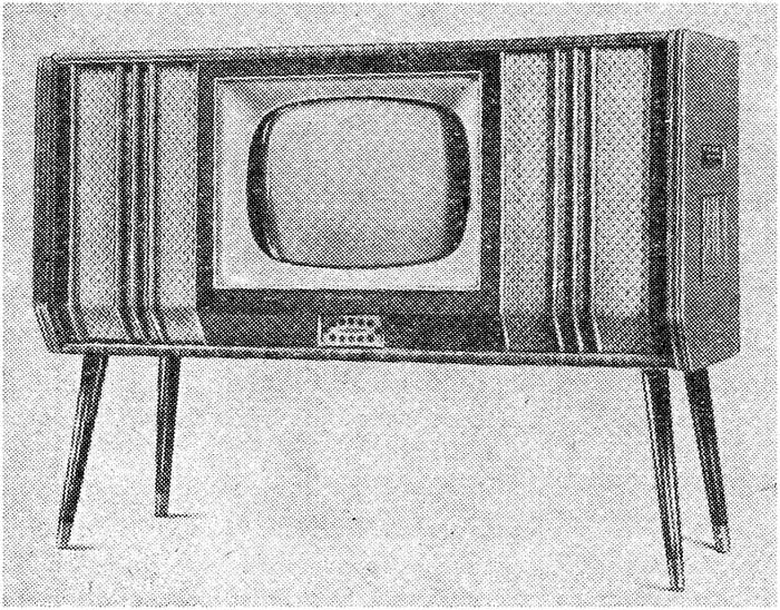 в виде горизонтальной консольной модели на ножках. В центре футляра установлен телевизор, слева