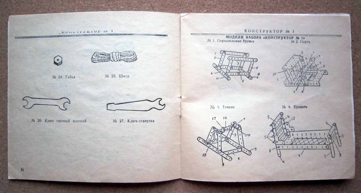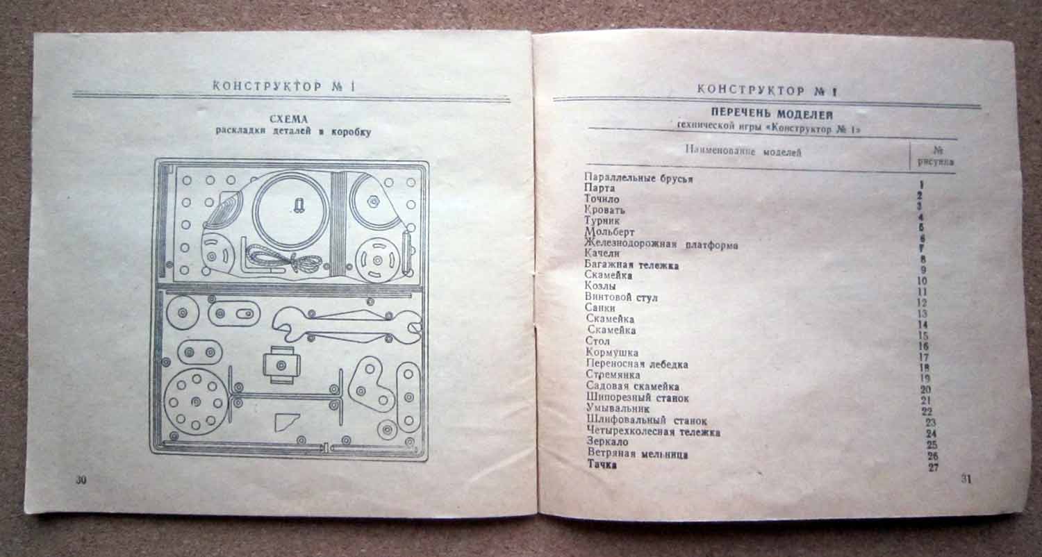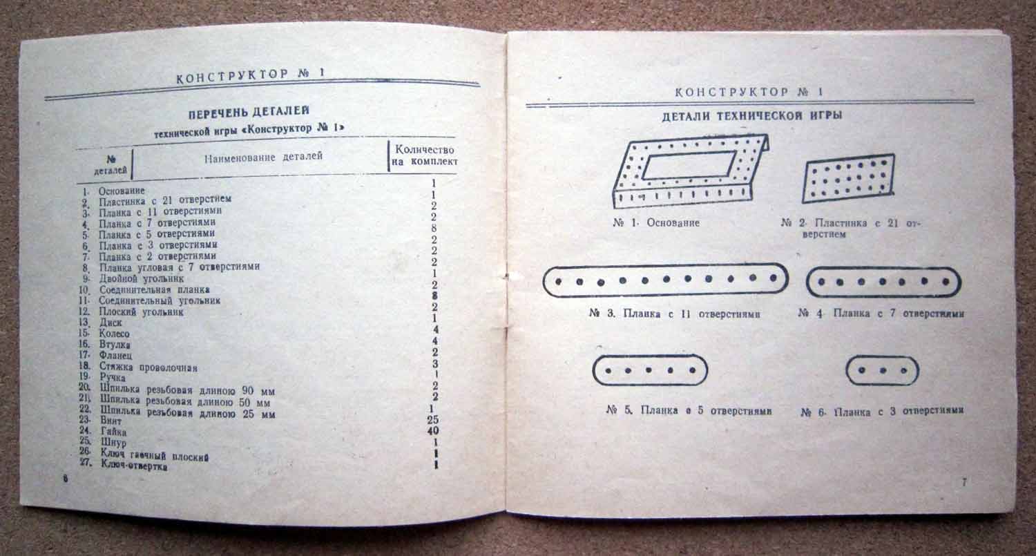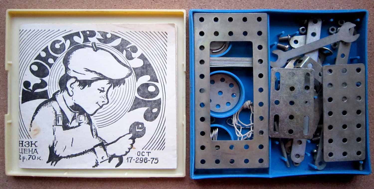 Детская техническая игра "Конструктор № 1" производилась предположительно с 1975 года. Игра предназначена детям младшего и старшего школьного возраста для сборки более 30-ти металлических моделей.