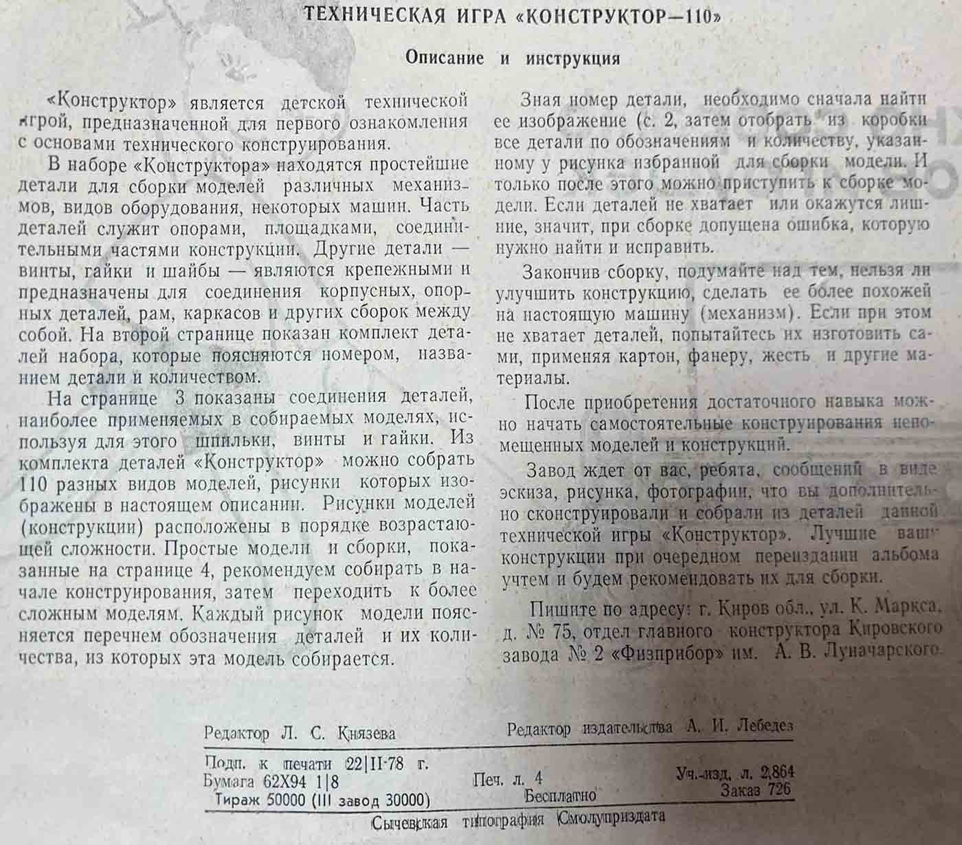 Конструктор металлический "110 видов игрушек" выпускался с 1978 года Кировским заводом № 2 Физприбор. Служит для сборки 110 игрушек детьми от 6 до 12 лет.