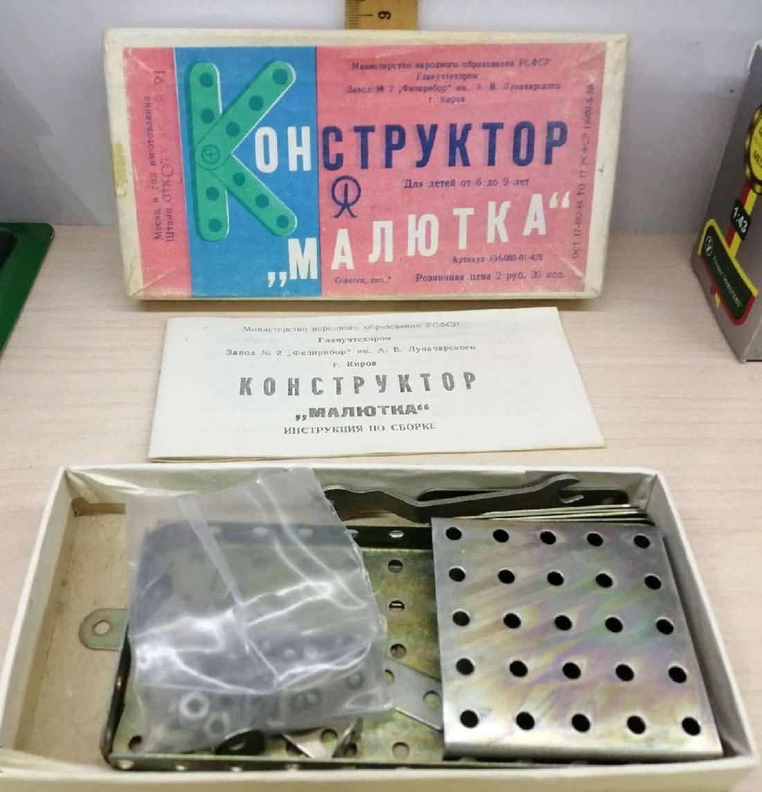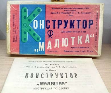 Конструктор "Малютка" выпускался возможно с 1985 года Кировским заводом № 2 (Физприбор). Предназначен для сборки моделей детьми 6...9 лет.