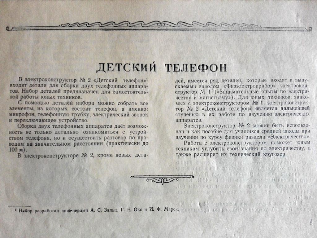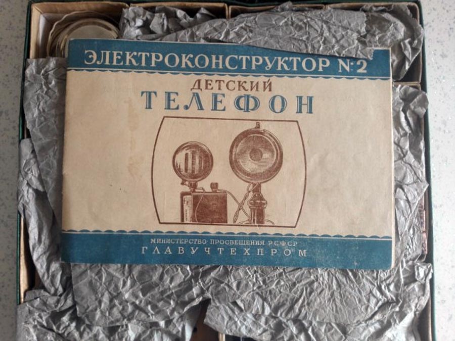 Электроконструктор №2 "Детский телефон" выпускался возможно с 1951 года Московским заводом "Физэлектроприбор". Конструктор выпускался более 15 лет.