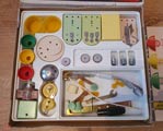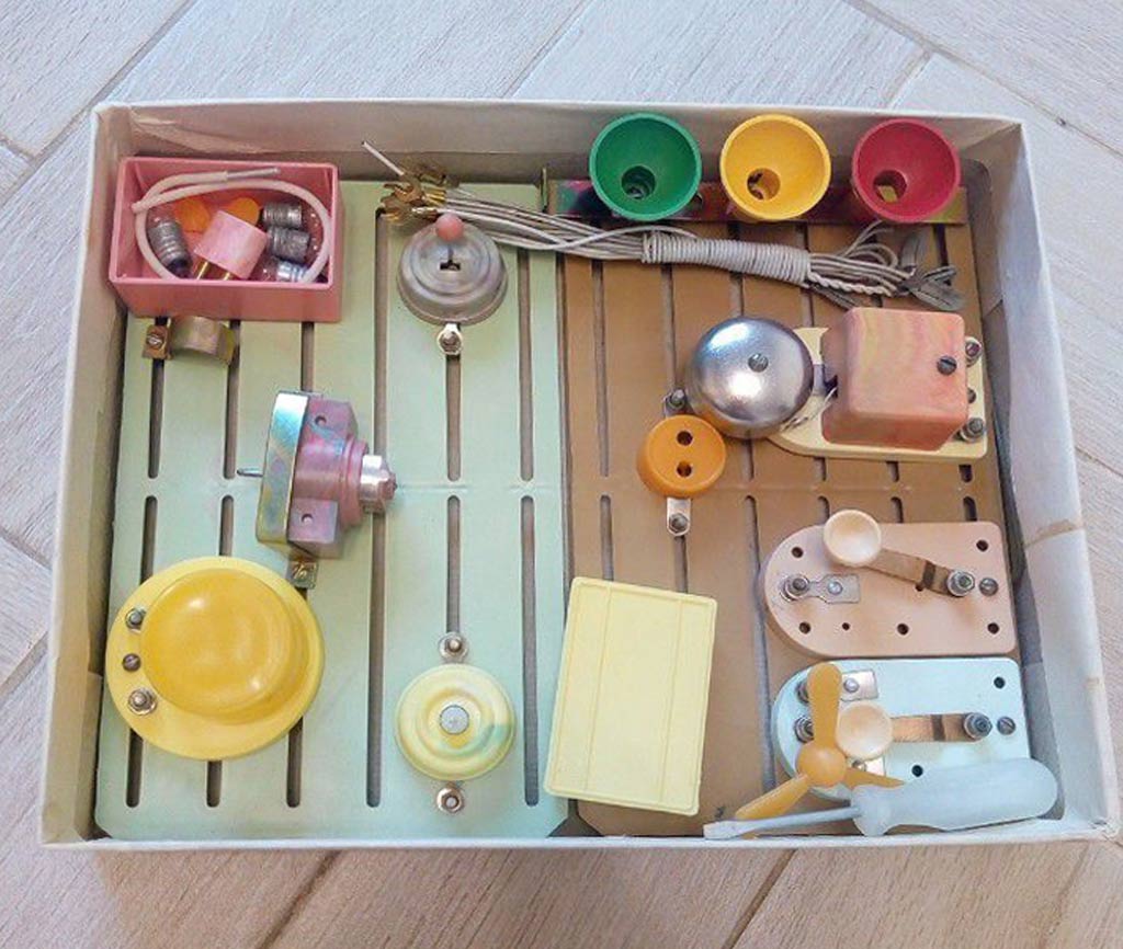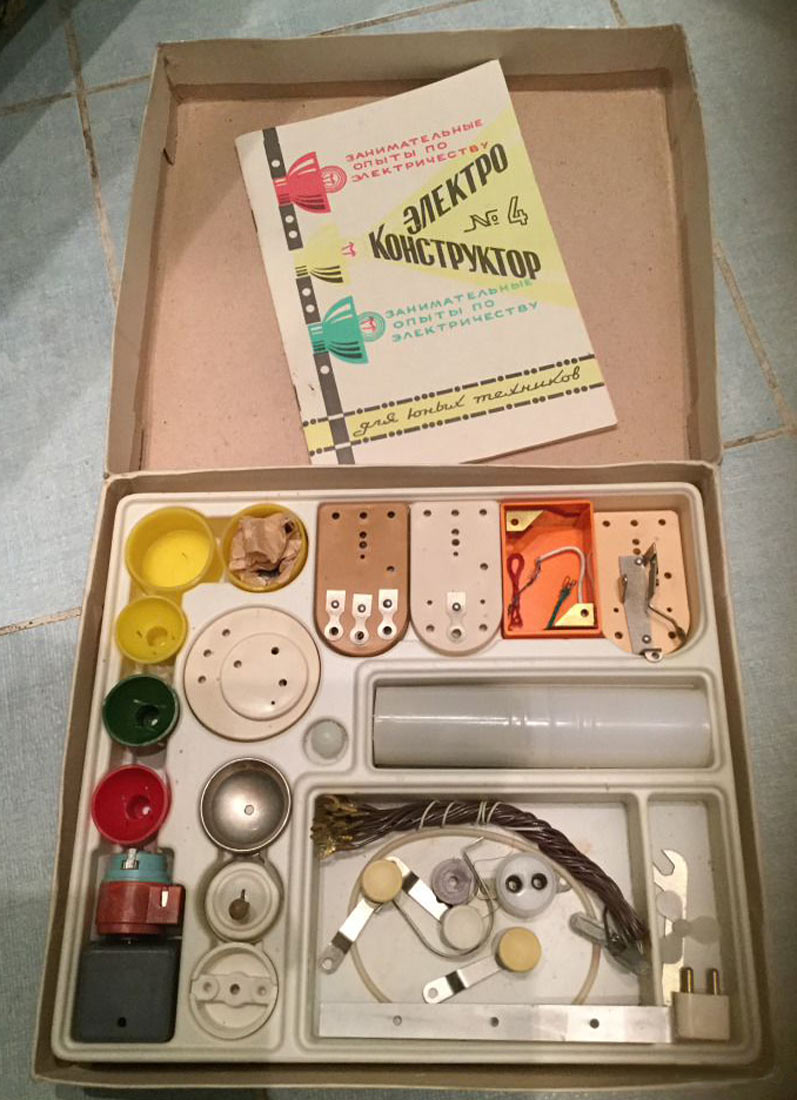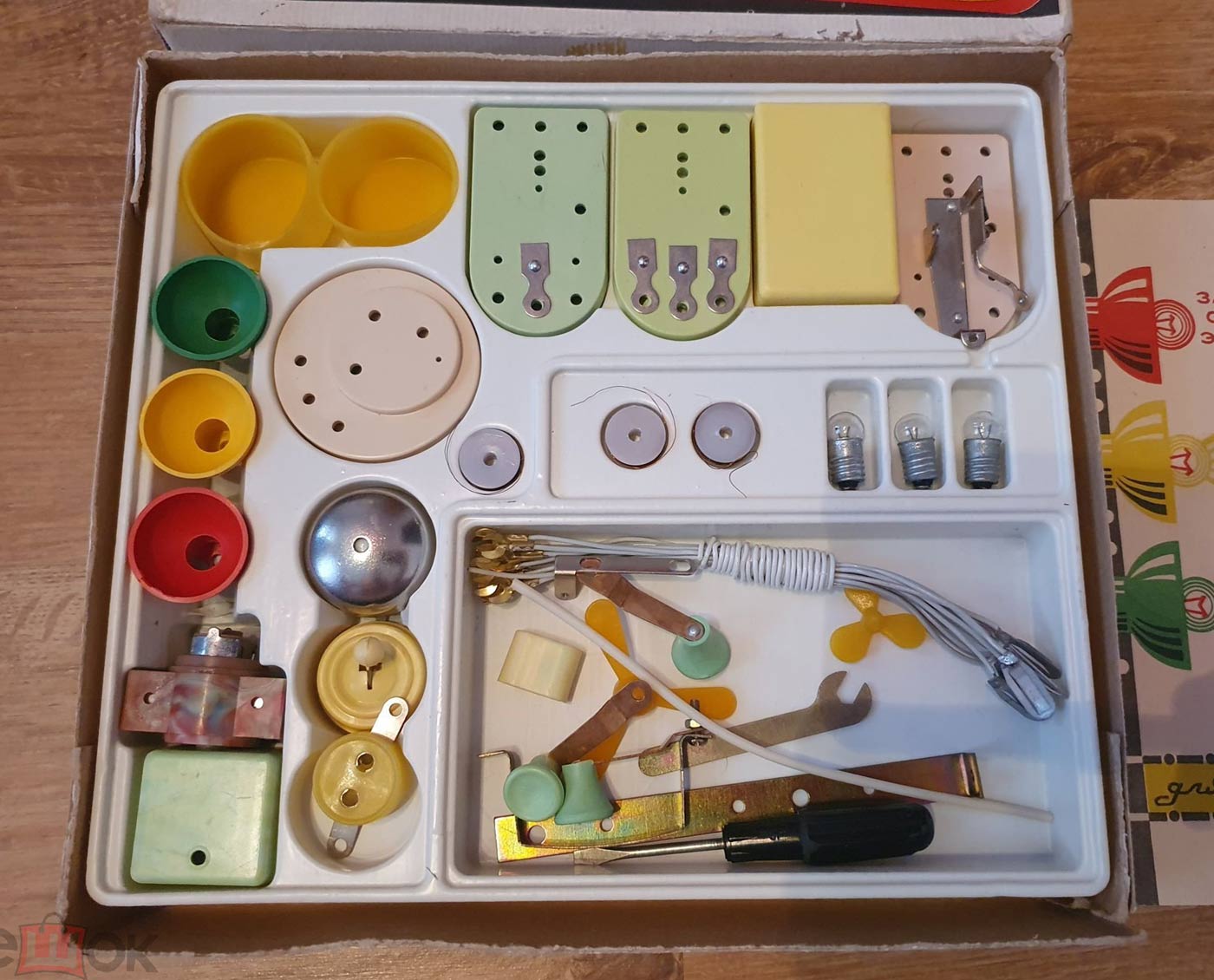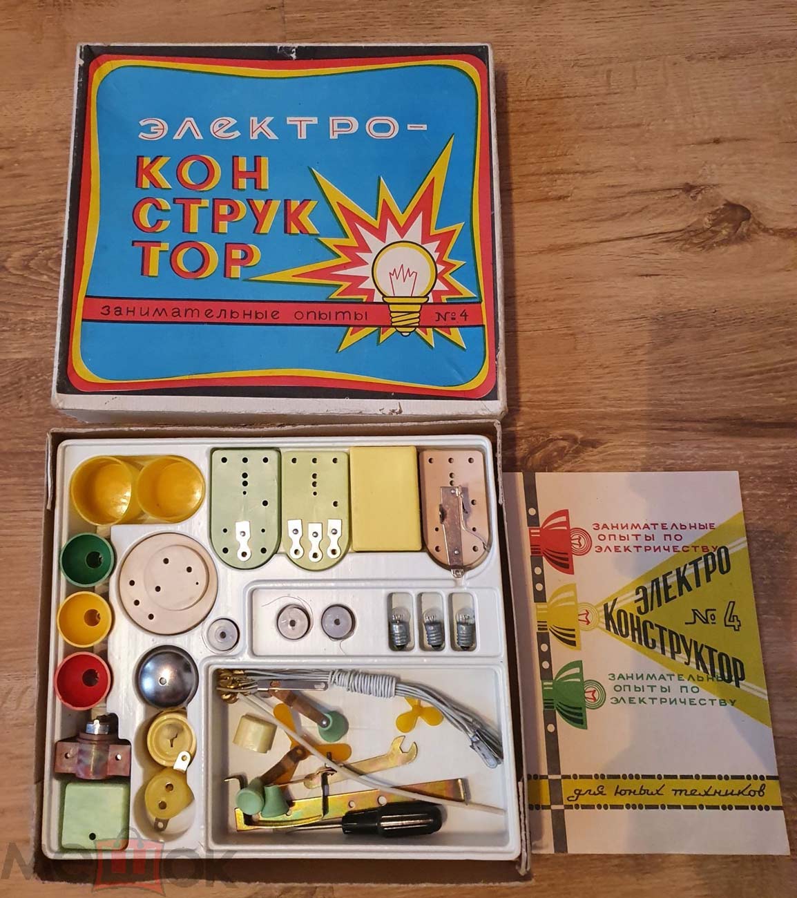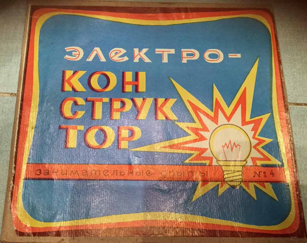 Занимательные опыты по электричеству "Электроконструктор № 4" выпускался предположительно с 1987 года Московским ПО "Геофизприбор". Описание нет.