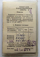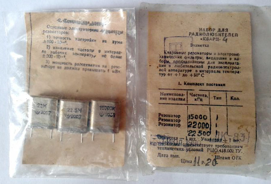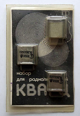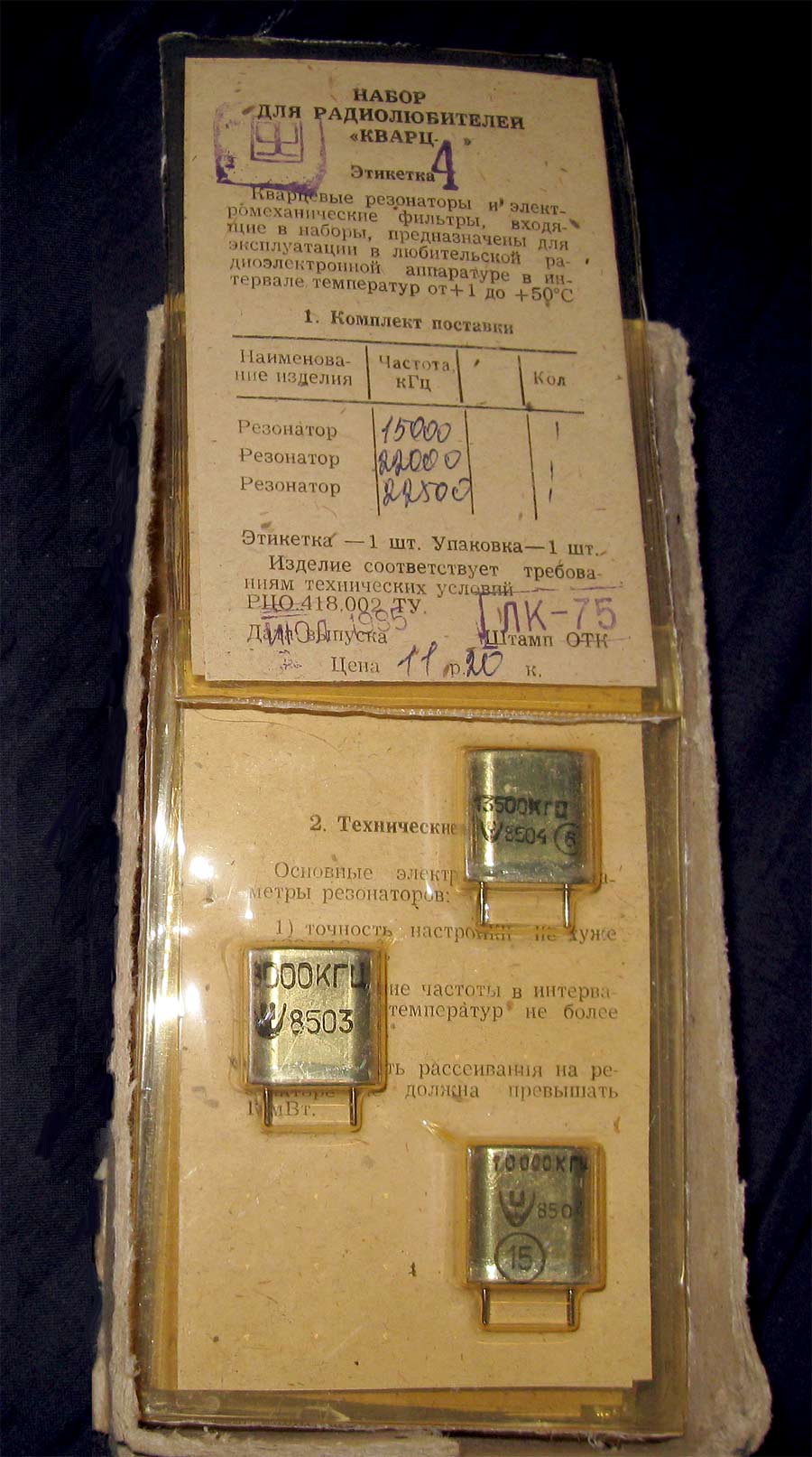 Набор для радиолюбителя "Кварц-4" выпускался предположительно с 1971 года. Набор кварцев (резонаторов) предназначен для применения в любительской приёмо-передающей радиоаппаратуре, в частности в популярном ламповом трансивере UW3DI.