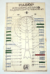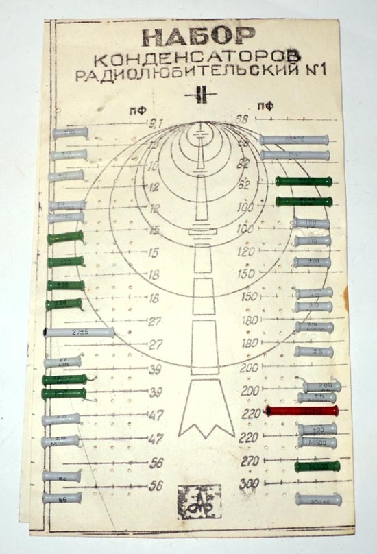 Набор конденсаторов радиолюбительский № 1 выпускался предположительно с 1971 года. В набор вложено по 1 и 2 шт. 34 трубчатых конденсатора ёмкостью от 9,1 до 300 пф.