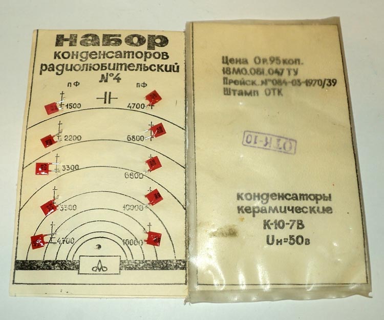 Набор конденсаторов радиолюбительский № 4 выпускался предположительно с 1971 года. Содержит 10 керамических конденсаторов ёмкостью от 1500 до 10000 пф.