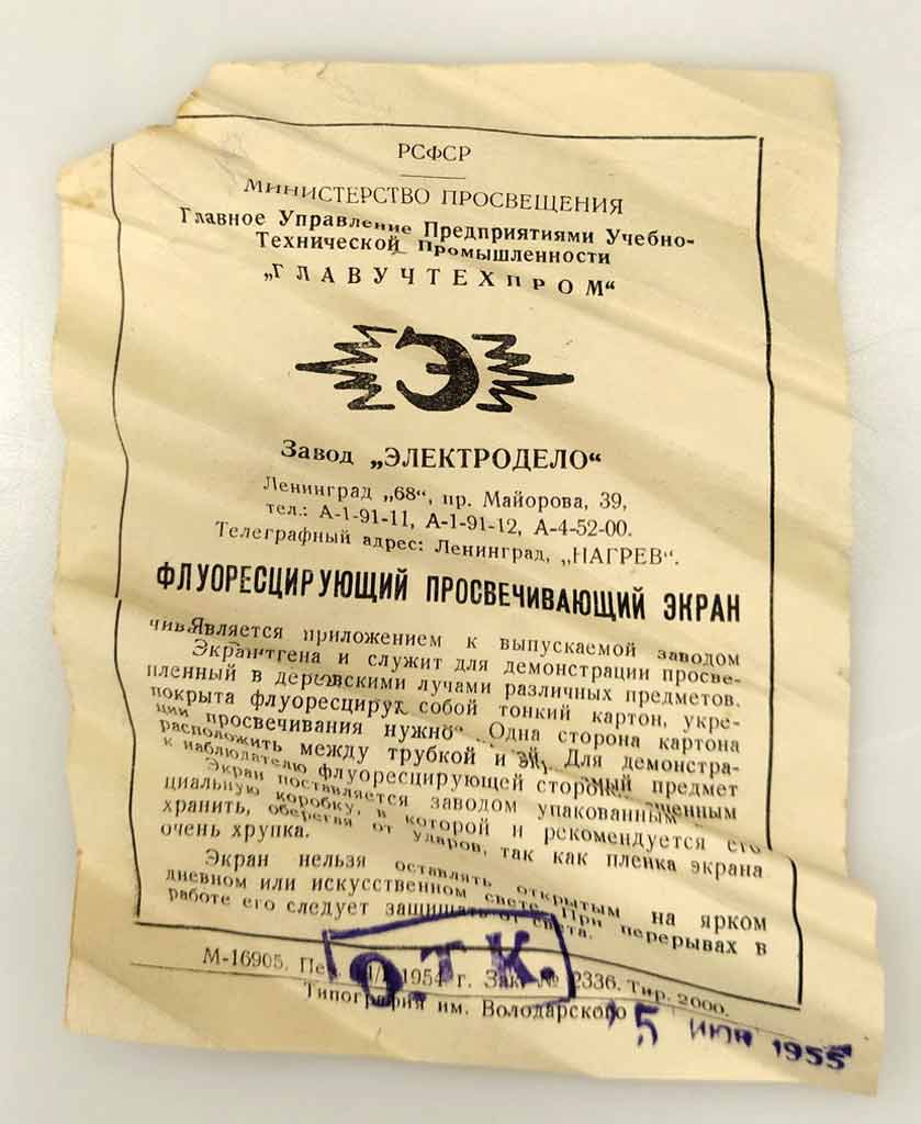 Экран к трубке Рентгена (Флуоресцирующий просвечивающий экран) выпускал с 1955 года Ленинградский завод "Электродело".