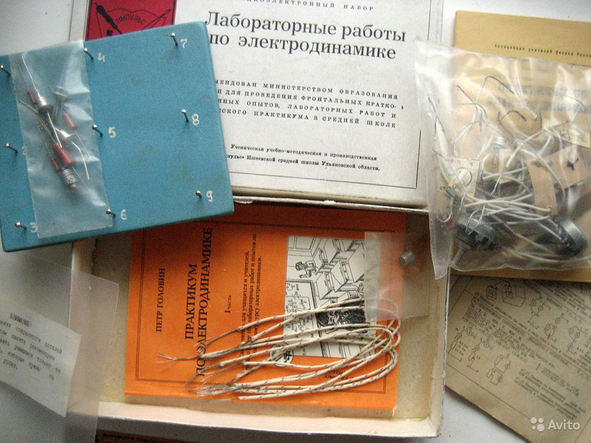 Радиоэлектронный набор "Лабораторные работы по электродинамике" с 1993 года выпускала Ульяновская фирма "Импульс". Для опытов по электродинамике и практикума на уроках физики в средней школе.