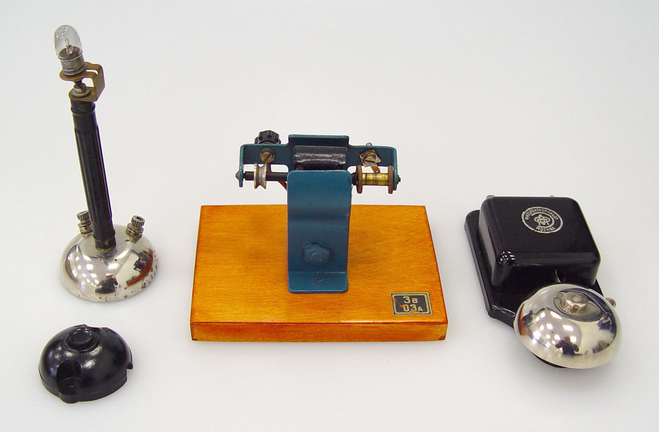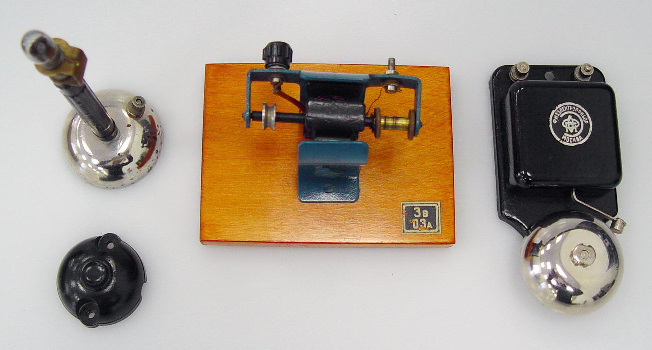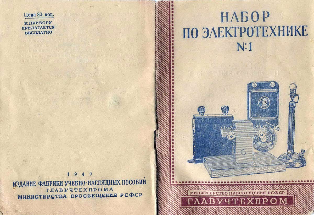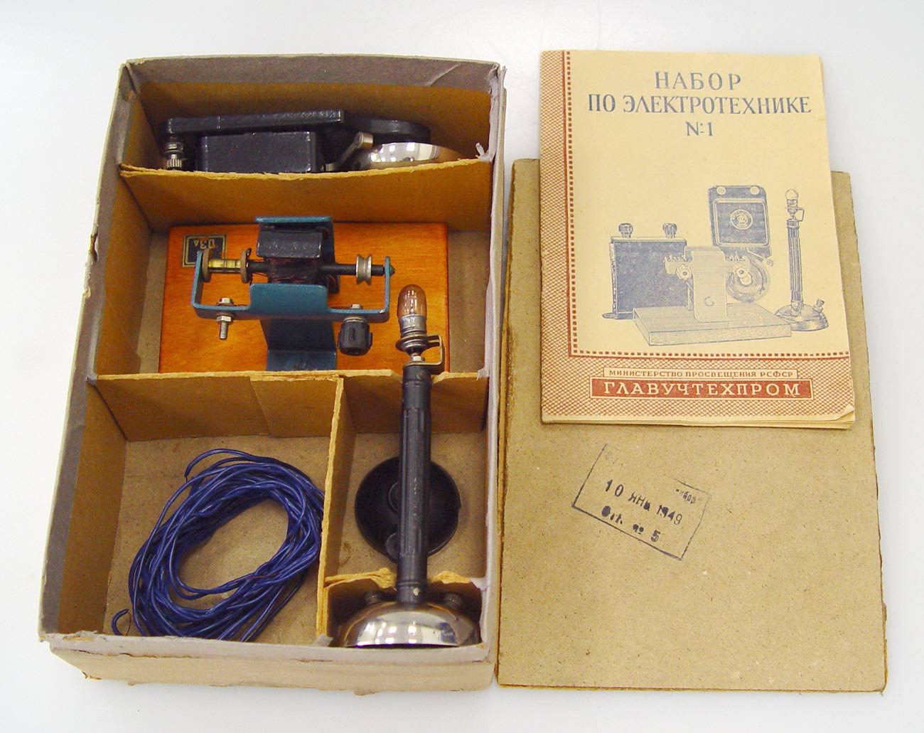 Набор по электротехнике №1 выпускал с 1949 года Московский завод "Физэлектроприбор". Демонстрация таких устройств как; настольная лампа, выключатель, звонок и электродвигатель.