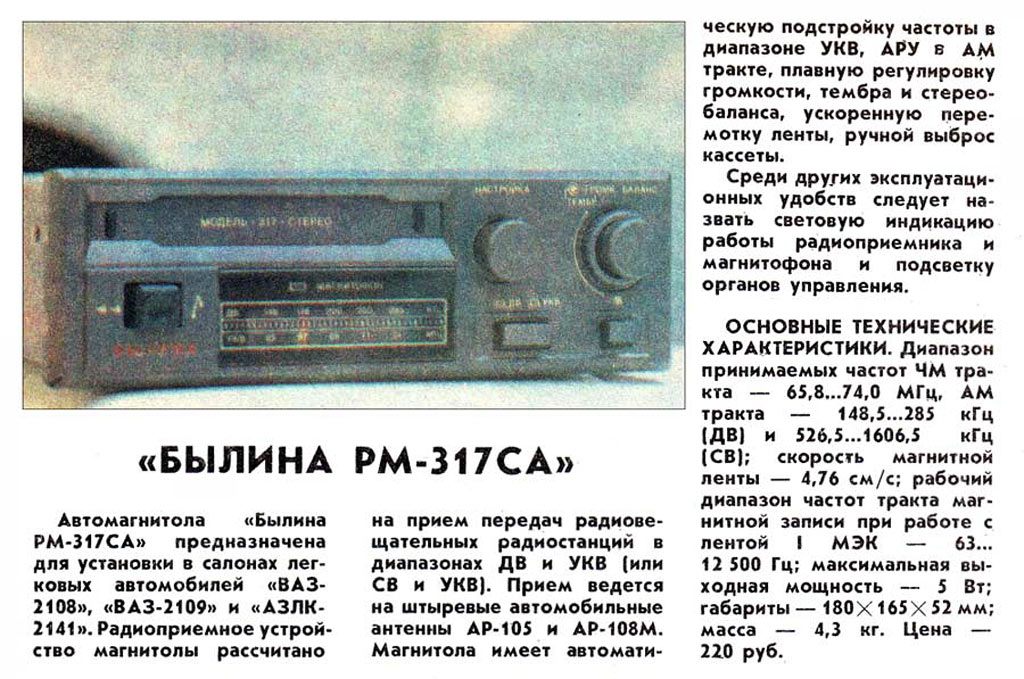 магнитолы - 180х165х52 мм; масса 4,3 кг. Цена 220 рублей. С 1990 года Рязанский