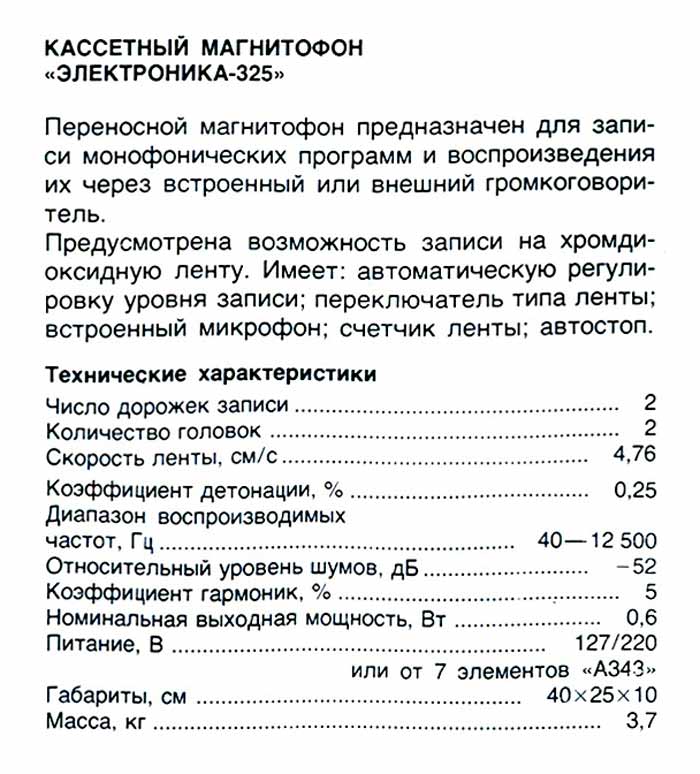 опытных экземпляров. Описание магнитофона "Электроника-325" (МФ) и его