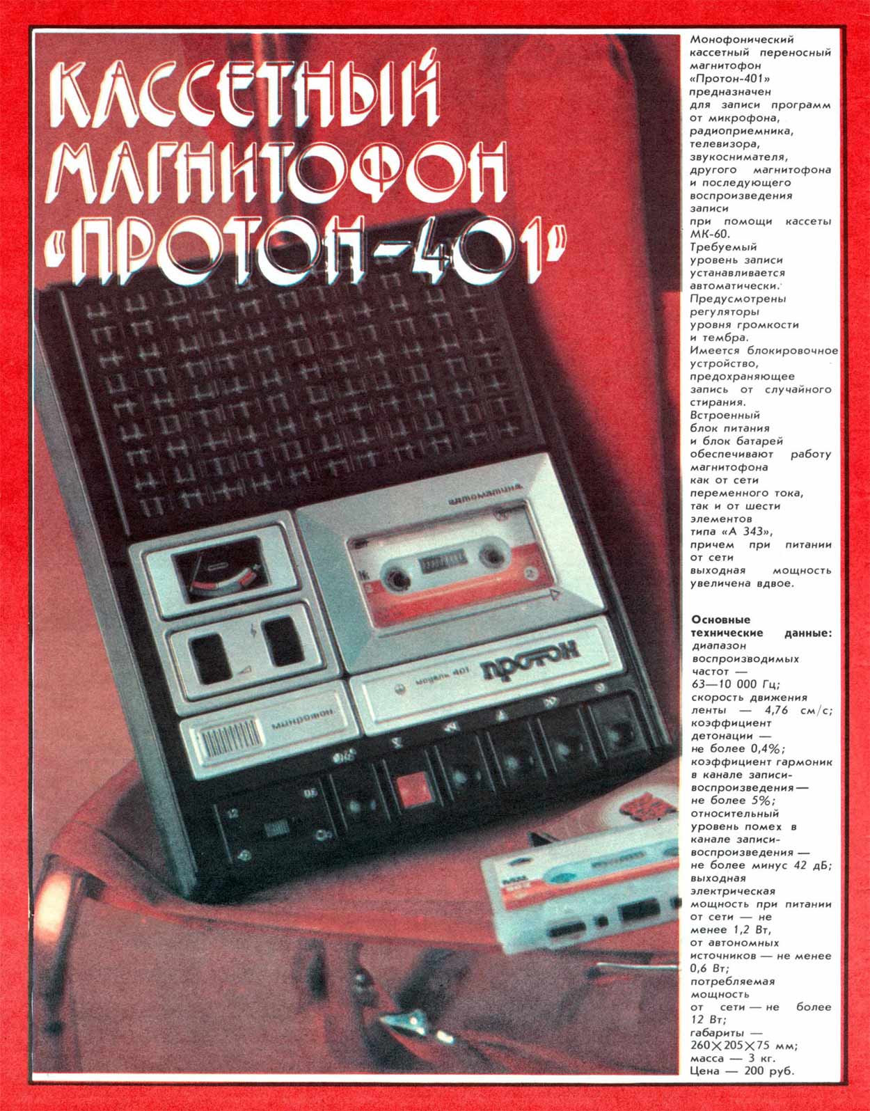 масса 3 кг. Розничная цена магнитофона 200 рублей.