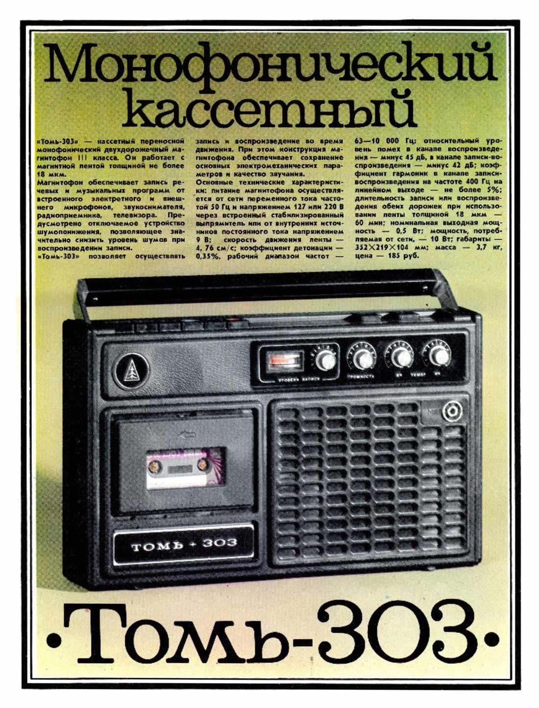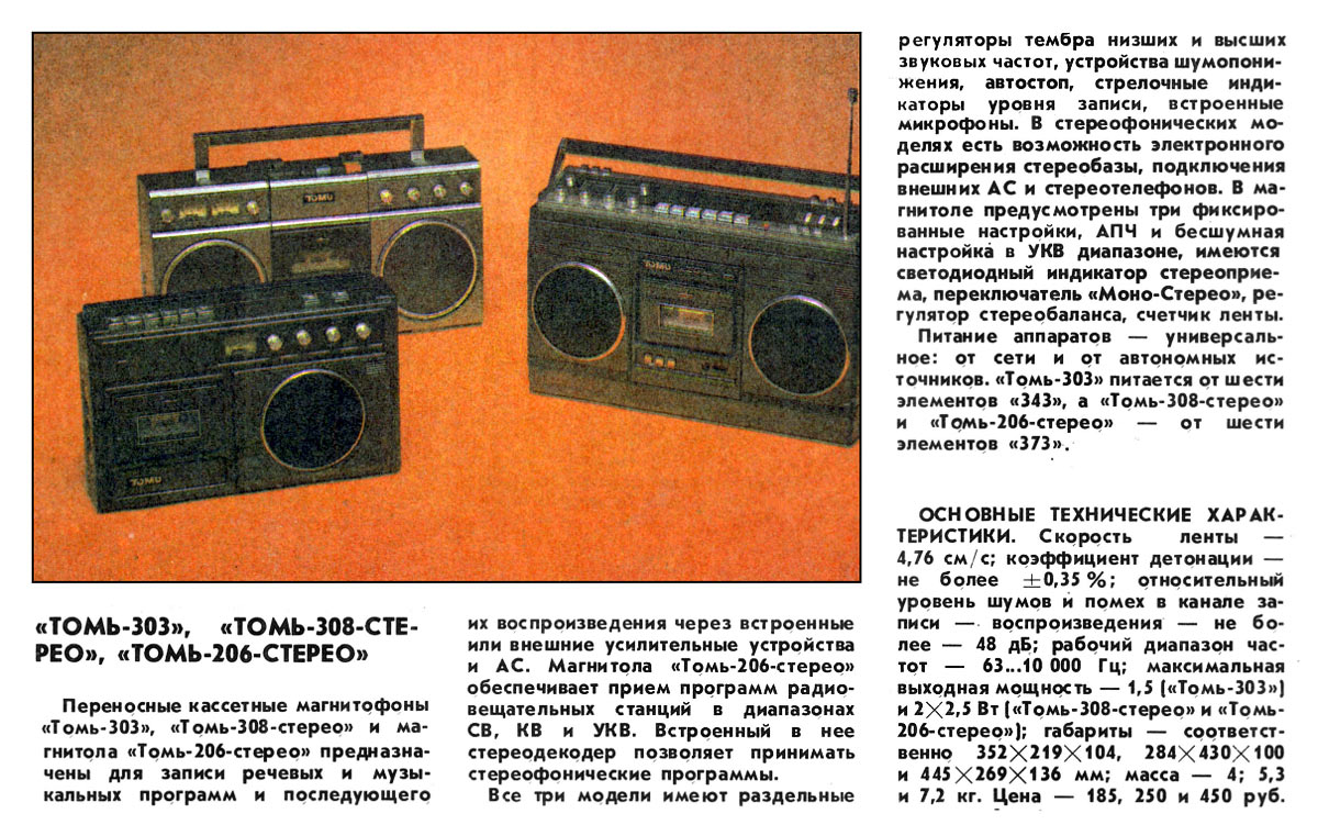 4 кг. С 1987 года завод выпускал магнитофоны ''Томь М-303'' с таким же