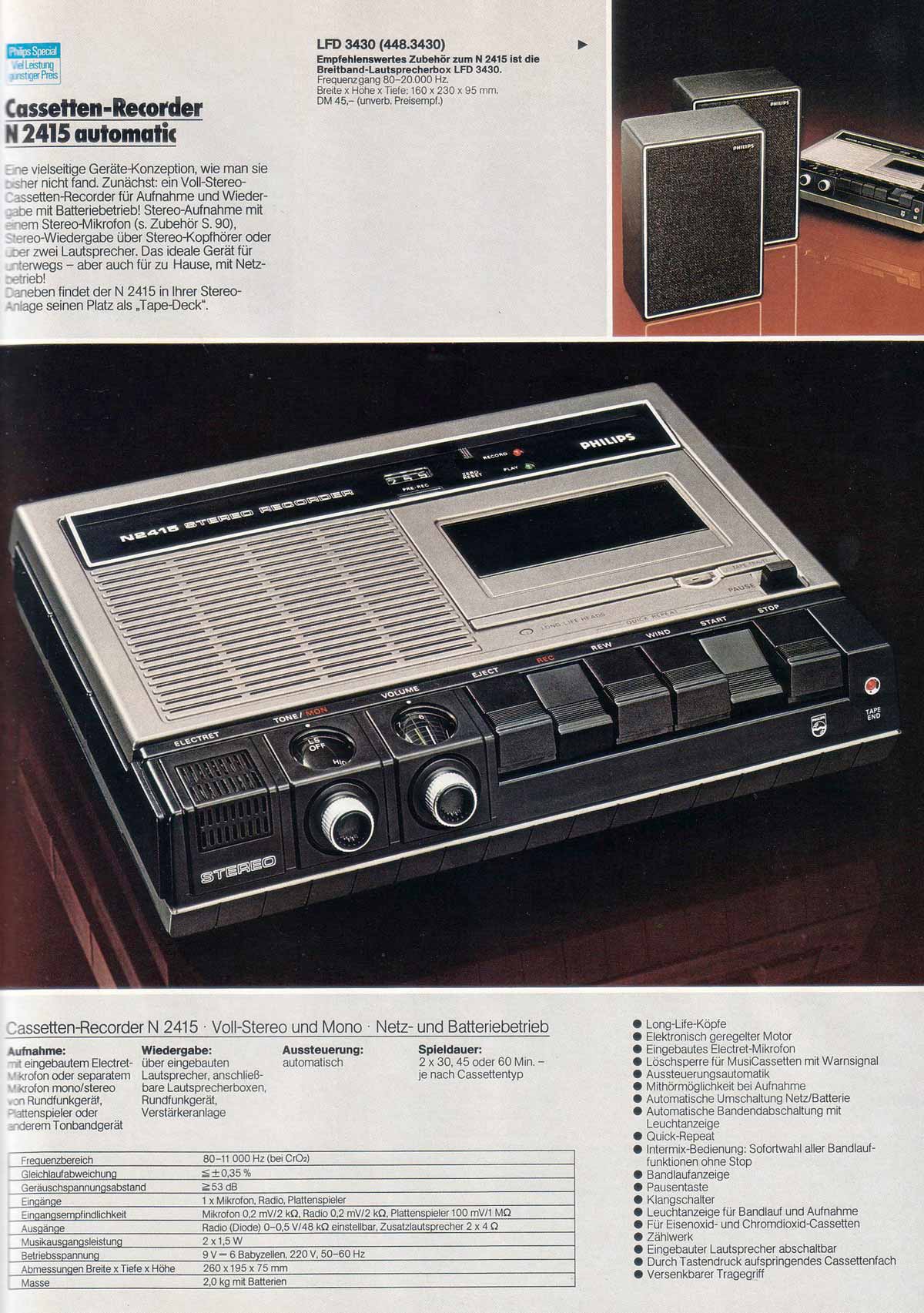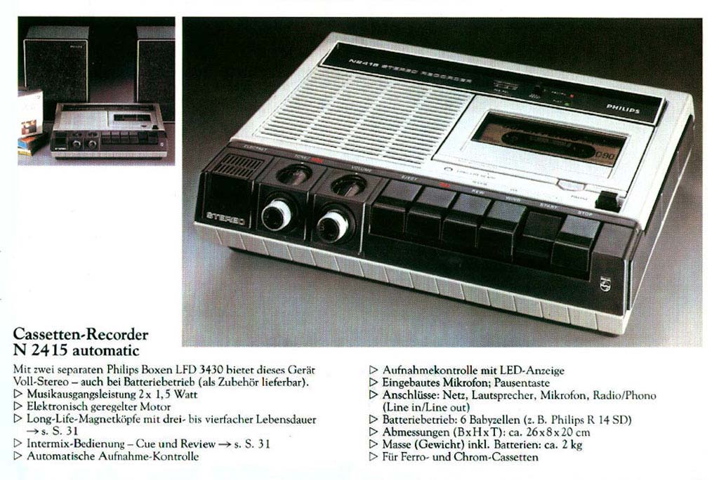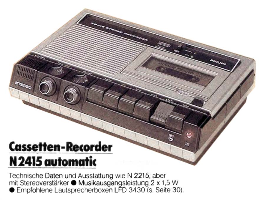 Портативный кассетный стереофонический магнитофон "Philips N-2415" с 1977 года выпускала фирма "Philips", Австрия. Полная информация о технических характеристиках магнитофона в рекламных проспектах.