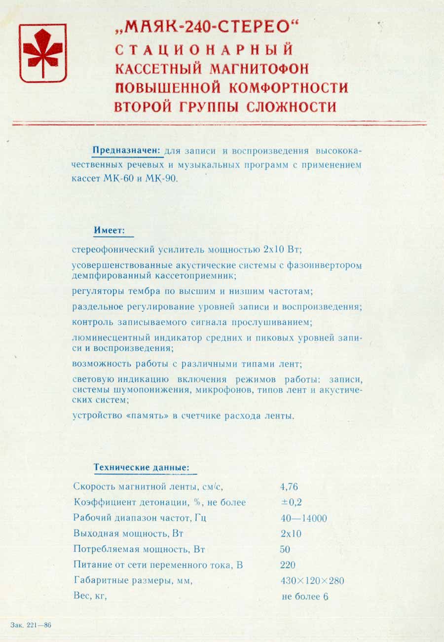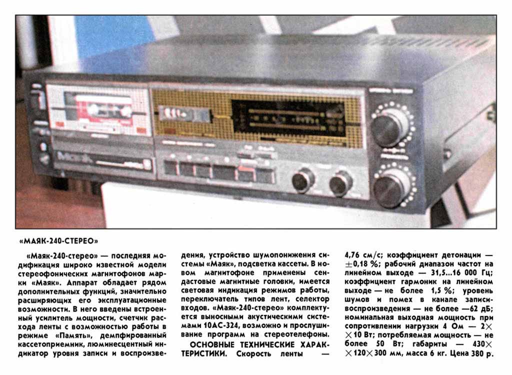как "Маяк М-240С". Магнитофон предназначен для записи и воспроизведения