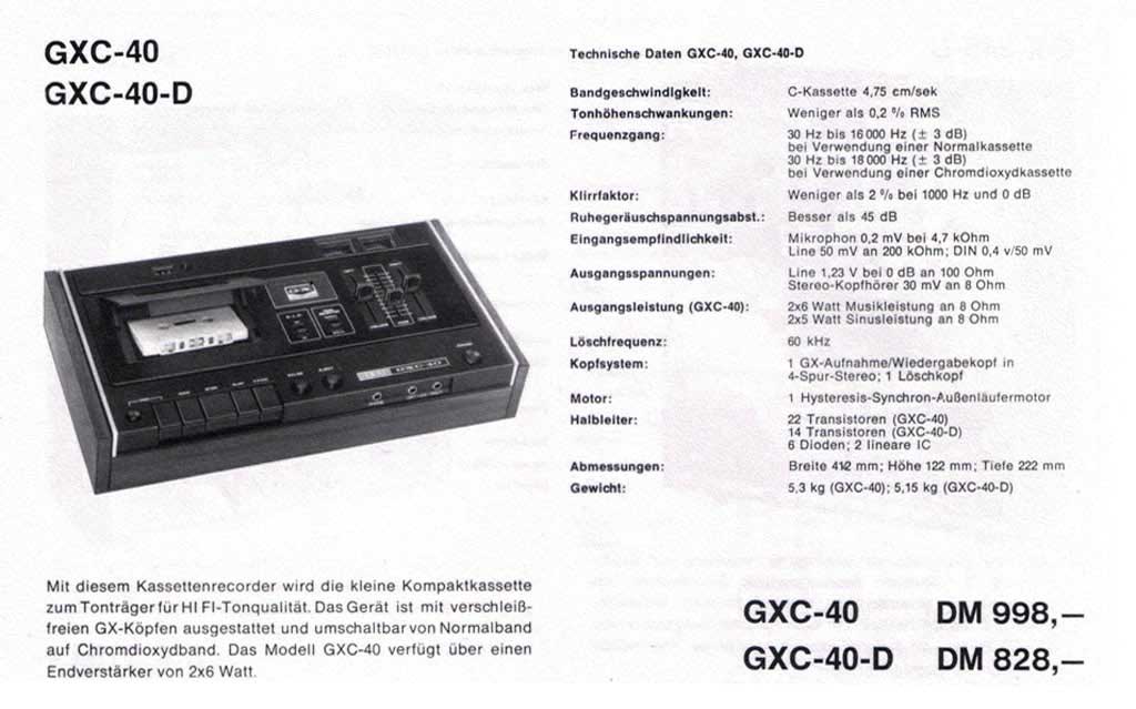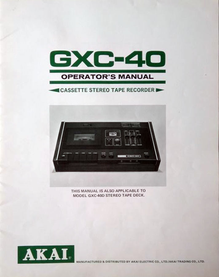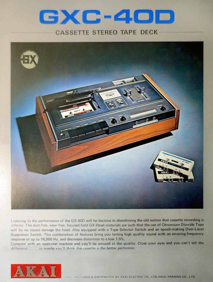 Стационарный кассетный магнитофон "Akai GXC-40/D" выпускался с 1973 года компанией "Akai Electric", Токио. Вся информация о магнитофоне имеется в фотографиях и в рекламных и технических проспектах.