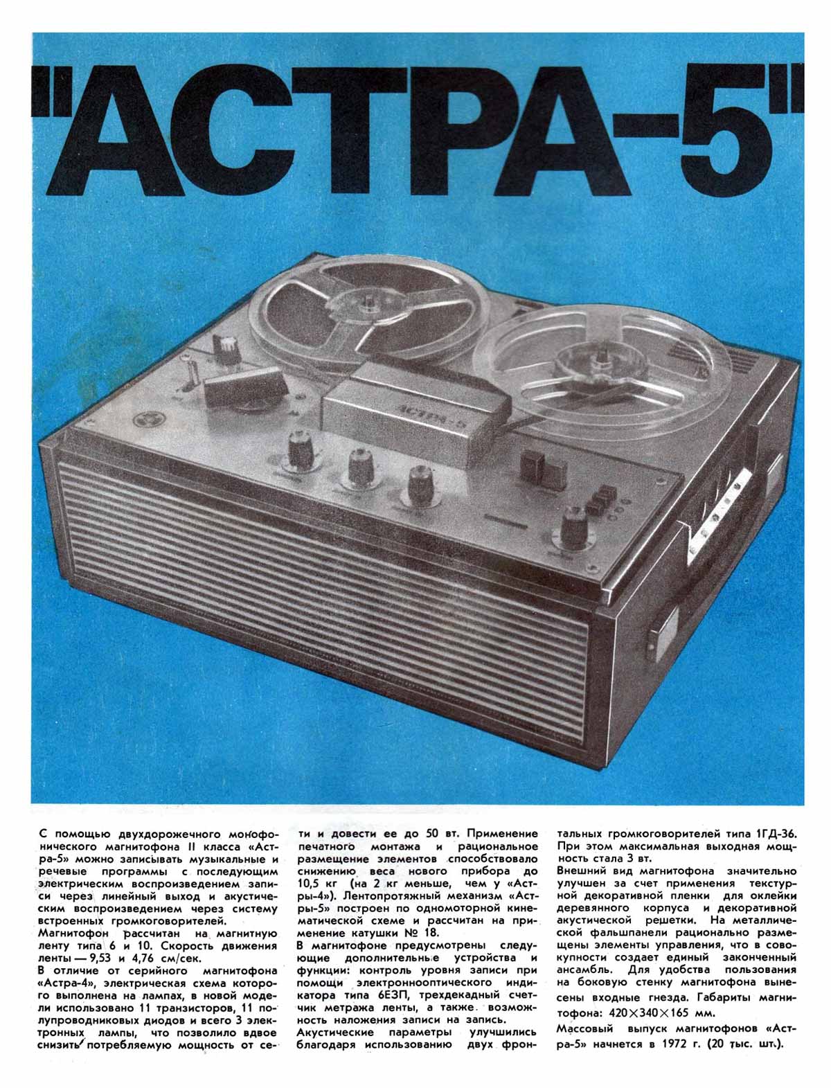 по входам. Магнитофонов "Астра-5" было выпущено около 20.000 экземпляров.