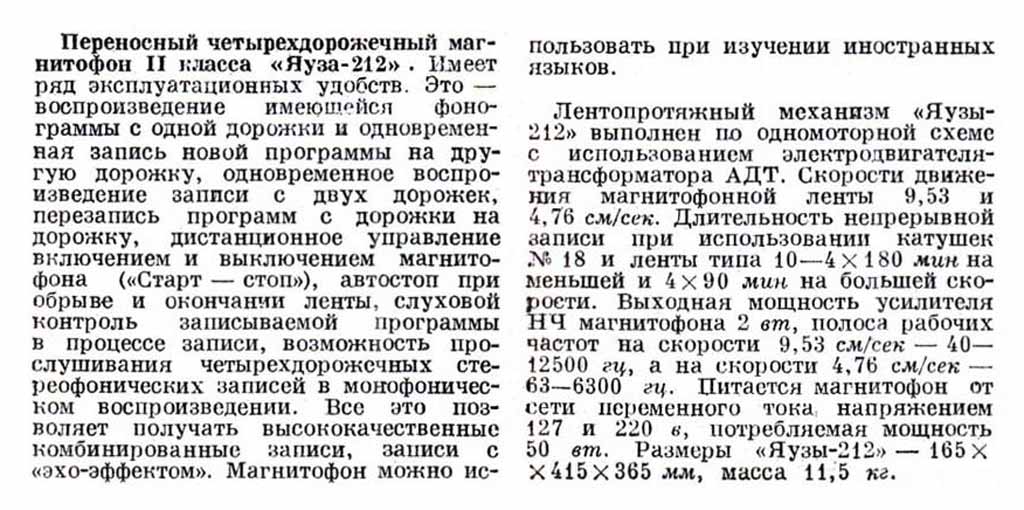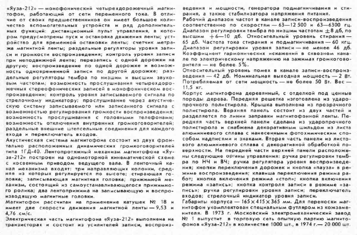 Описание магнитофона "Яуза-212" в журнале Радио