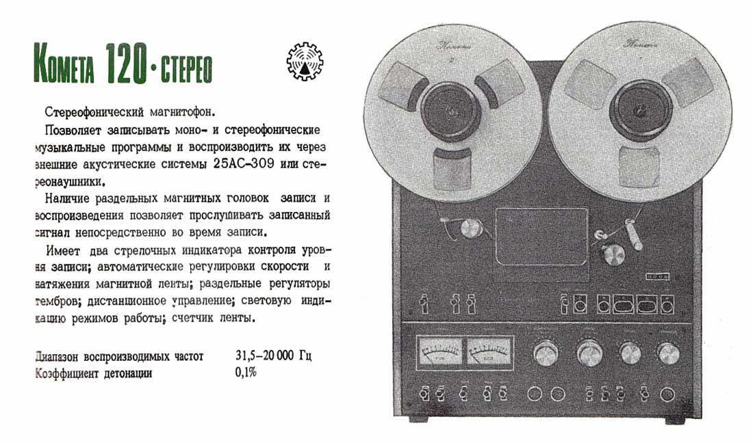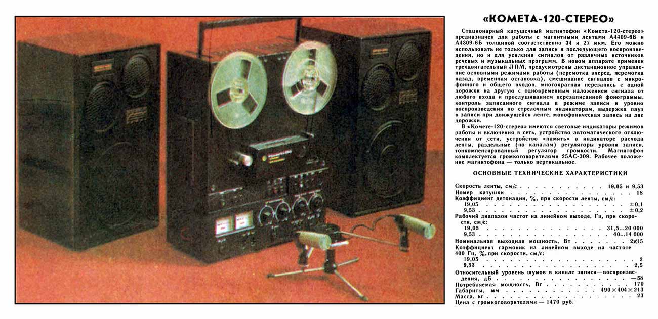 комплектуется АС типа "25АС-309". Скорость ленты 19,05 см/сек и 9,53 см/сек.