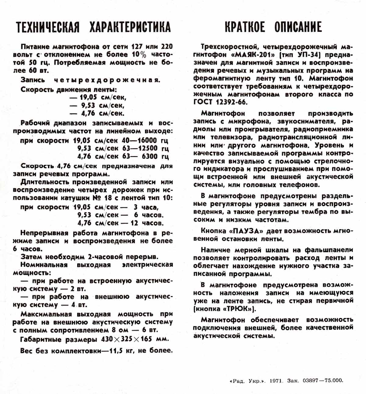 класса ''Маяк-201'' (тип УП-34) предназначен для четырёхдорожечной записи