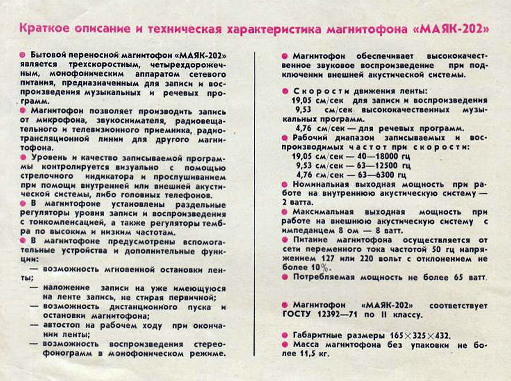 магнитофон второго класса ''Маяк-202'' разработан на базе серийной модели