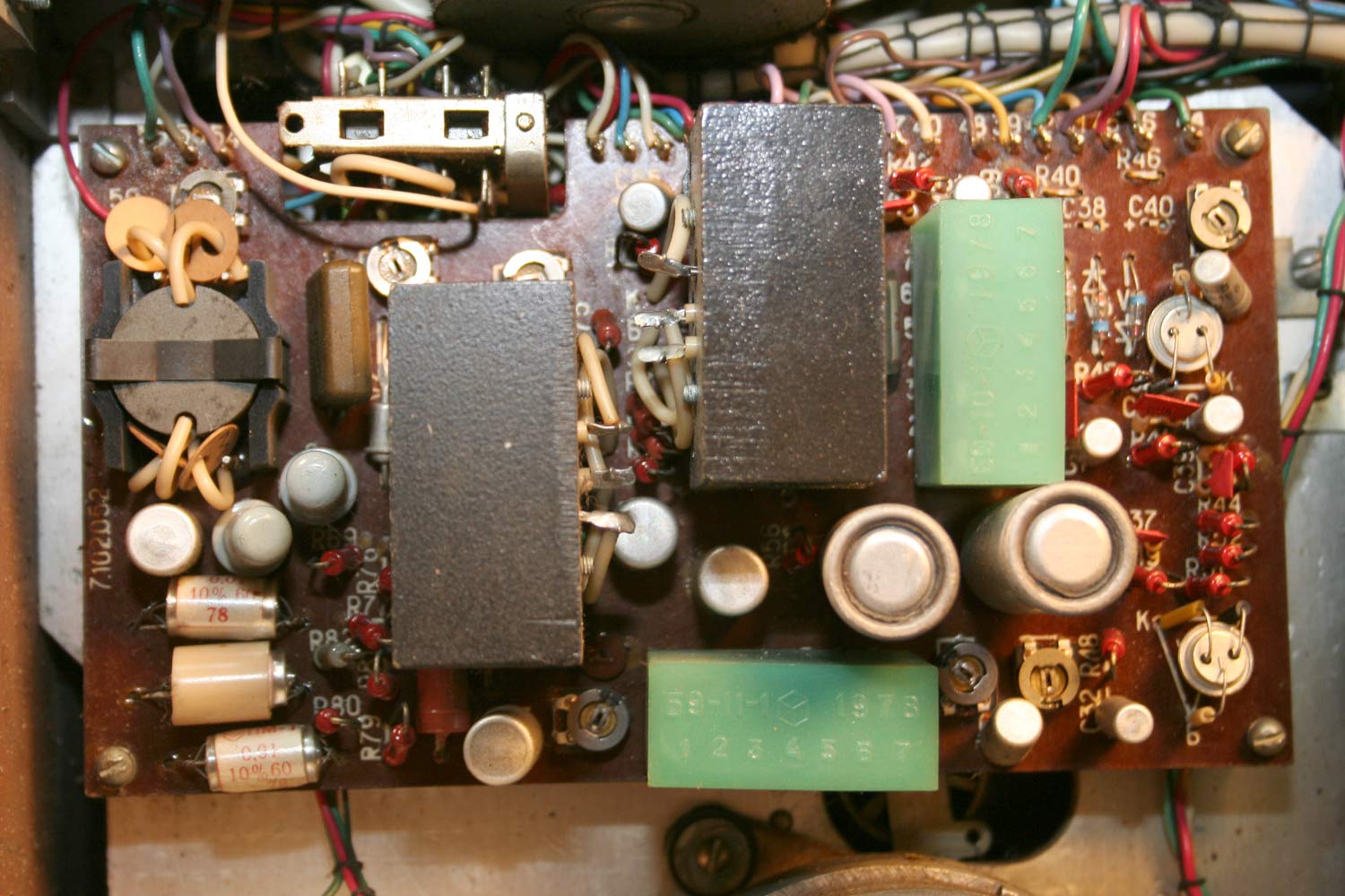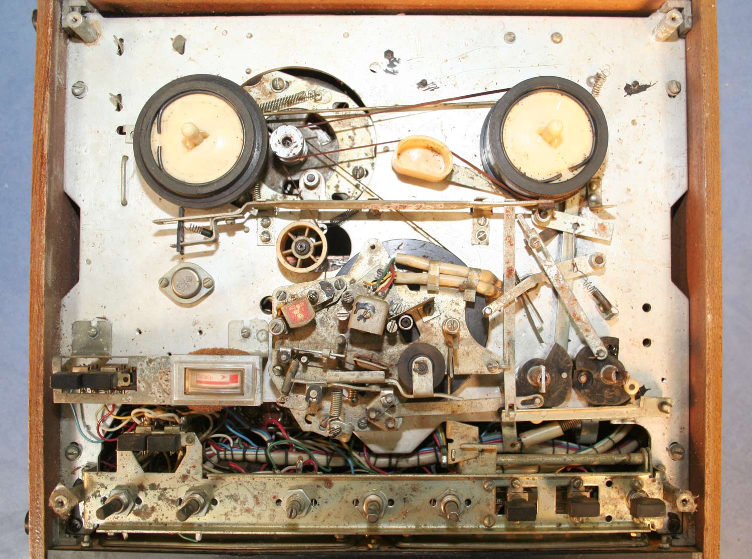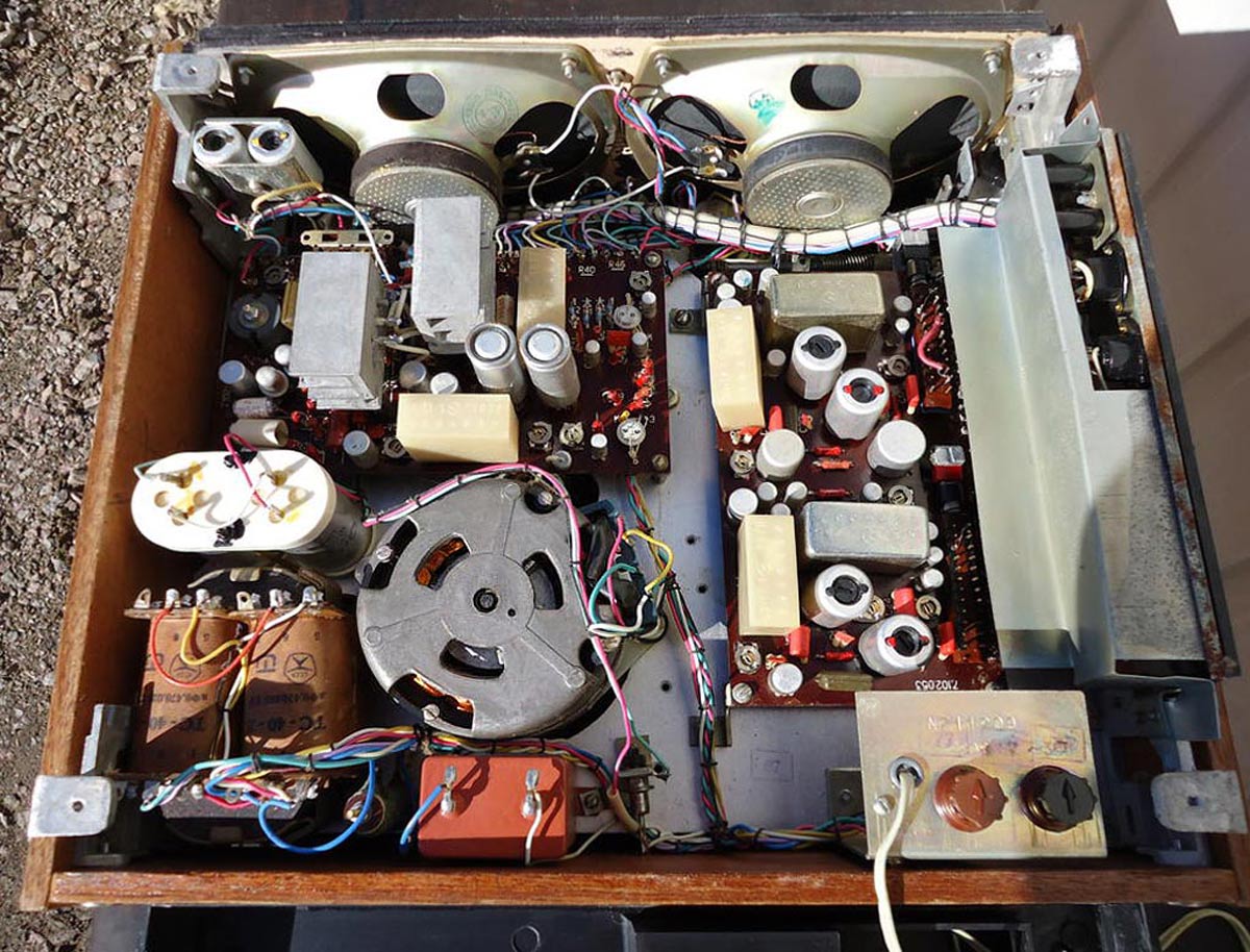 имеются регуляторы тембров, два стрелочных индикатора уровня записи, впоследствии